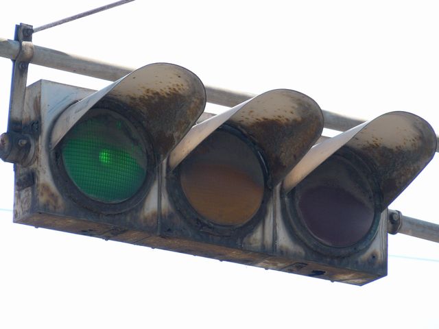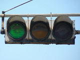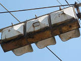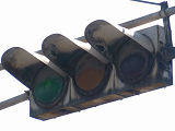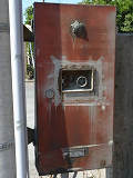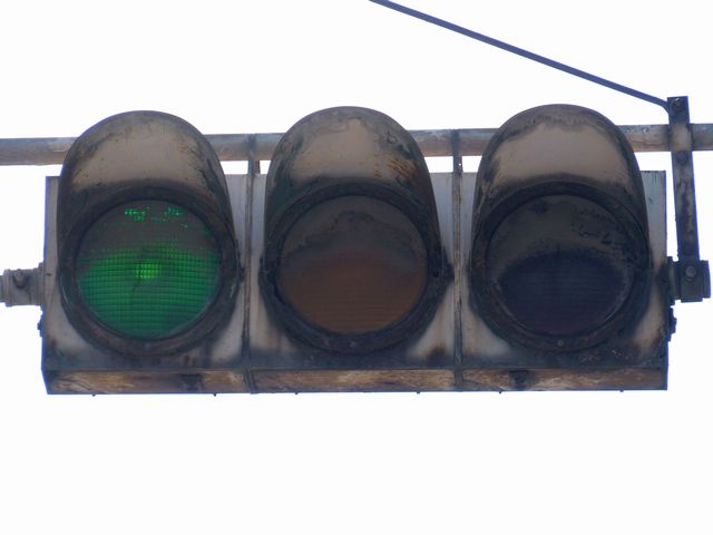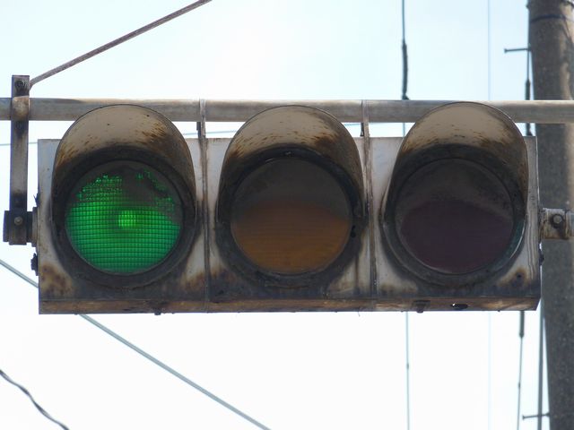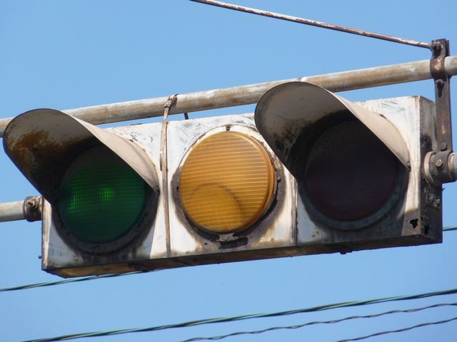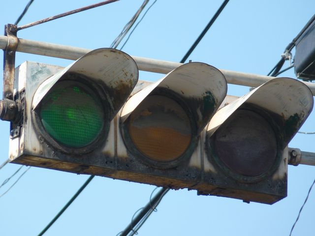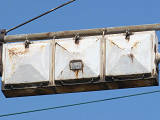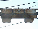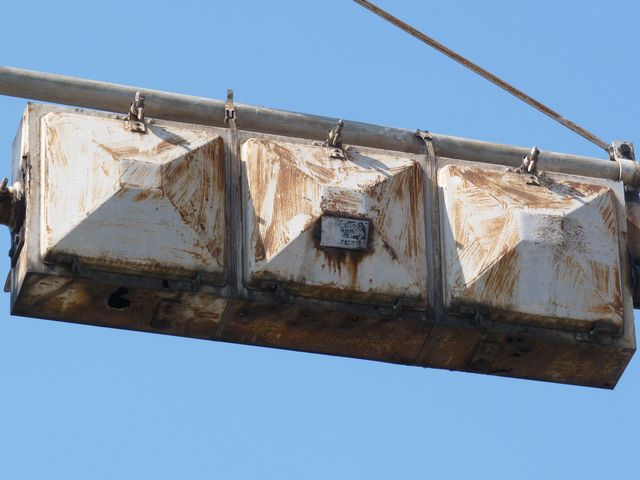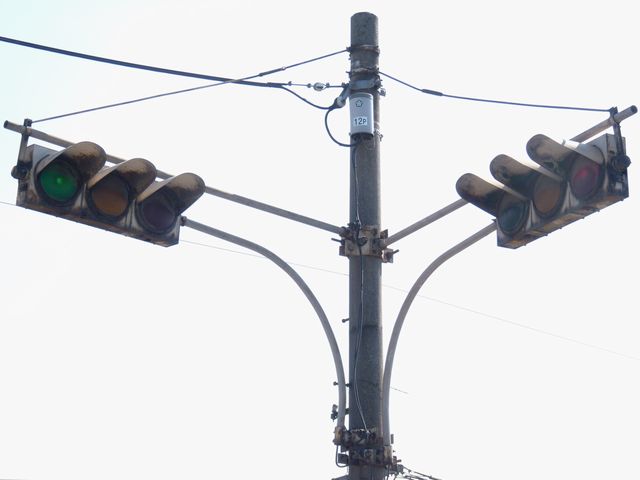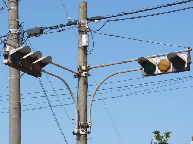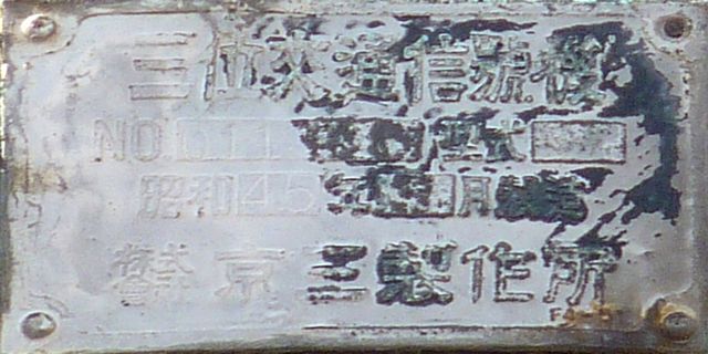 設置されている信号機についても、所有者・管理者が会社なのか警察なのか不明ですが、制御機や端子箱には旭日章がついています。 灯器は、京三製の角型灯器で、背面の蓋がピラミッド型の東日本タイプです。なぜか、灯器の付け根部分にあるべきアーム間隔保持金具がありません。その代わりか、いずれの灯器も灯箱自体を2本のバンドで上のアームに縛り付けています。 制御機は、信号の切り替わり時に「ガチャン」というリレー音の聞こえる古いタイプです。信号操作用小窓の扉が無くなっています。