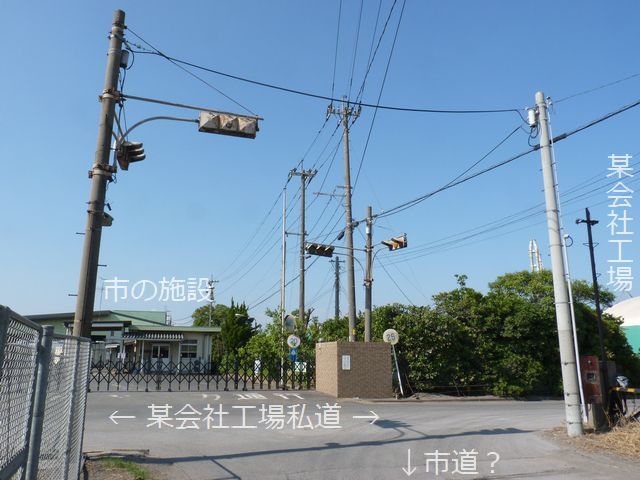 とある会社の工場用私道と公道(市道?)が交差する信号交差点です。交差点内が私道用地か公道用地かは不明ですが、市の施設の入口が面しているため、一般の車両や歩行者が通行できる交差点ではあるようです。調査時は日曜日で、車両、歩行者の通行はほとんどありませんでしたが、3色信号として動作していました。