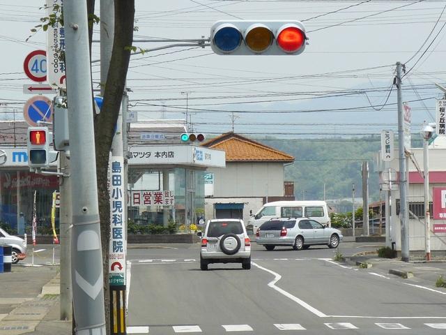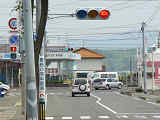 片側1車線と片側0.7車線の市道同士の交差点で、通常なら直径450mmレンズ灯器が設置されるような場所ではありませんが、約80m先に信号交差点があるので、誤認防止のために手前の交差点に直径450mmレンズ灯器を使用しているようです。