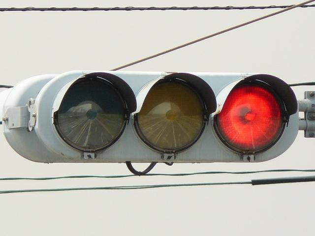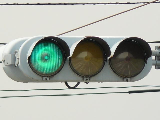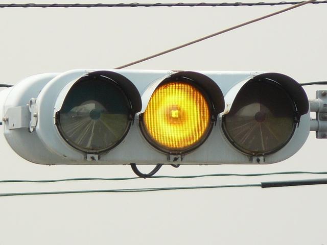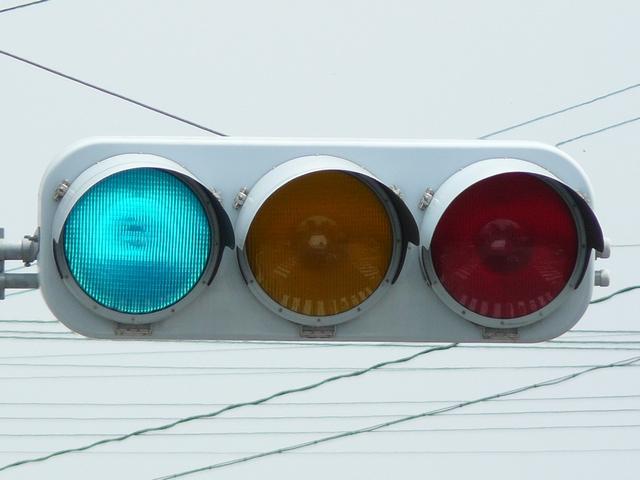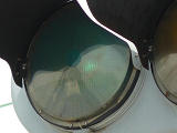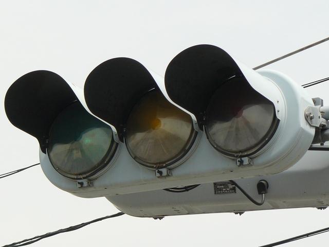 レンズ表面にスモーク掛かったフィルターが装着されています。交差点東西方向の補助灯器のみに装着されているため、西日対策の試験だと思われます。