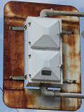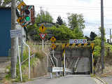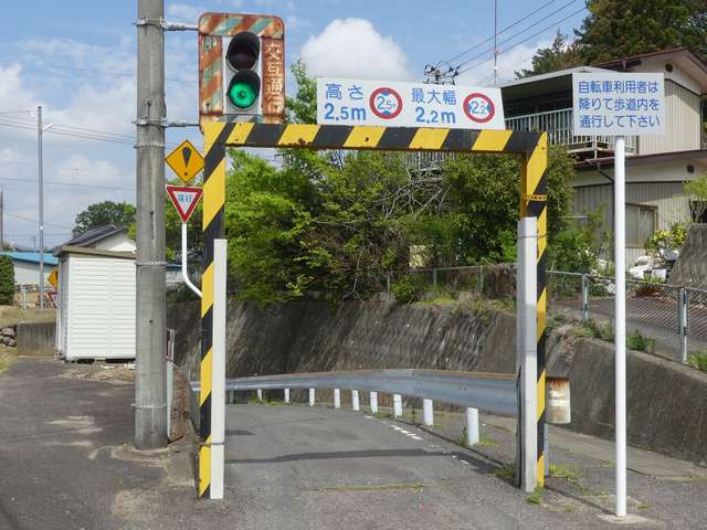 鉄道ガード下で、急坂、急カーブで見通しがが悪いうえに、車道幅が狭く、クルマのすれ違いができないため、信号による「交互通行」規制を行っています。区間の入口には高さと幅員制限のゲートがあり、軽自動車でもかなりの圧迫感を感じます。撮影している間に見てると、さすがに地元のクルマ、ハイエースでもスイスイと通っていきます。