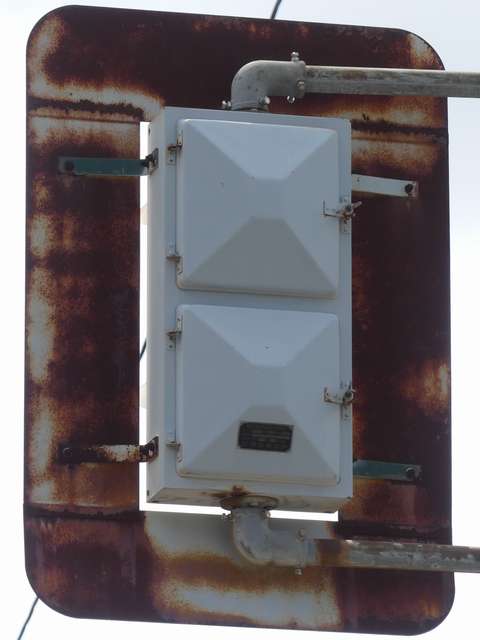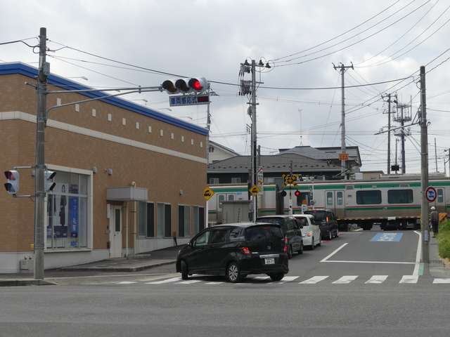 踏切から約30m離れた信号交差点の踏切直行側で、黄・黄・赤配列の灯器が使用されています。青信号の代わりに黄点滅し、注意喚起します。踏切信号ではなく交差点用の信号なので、踏切では信号に関係なく道交法33条本文により一時停止が必要です。信号は踏切とは連動しません。