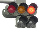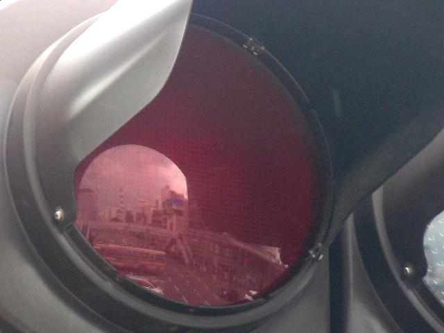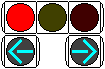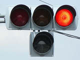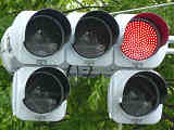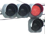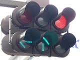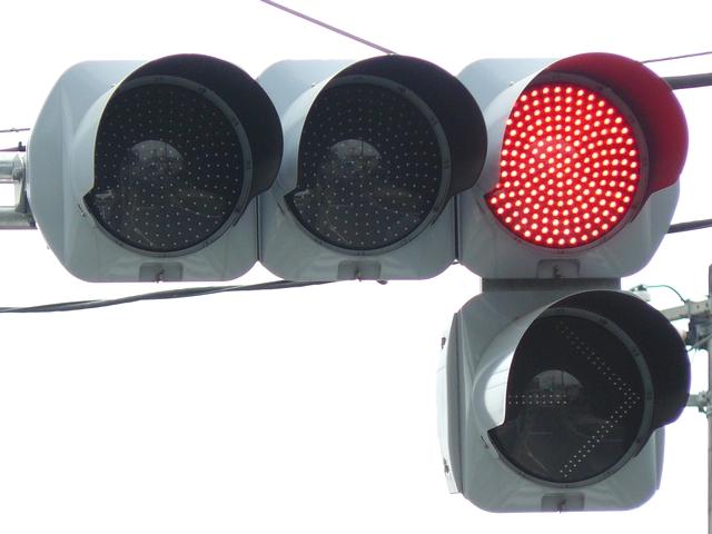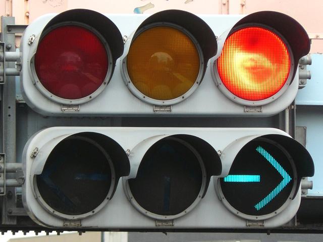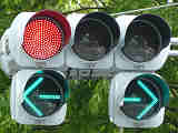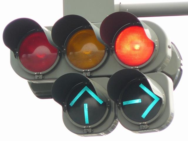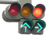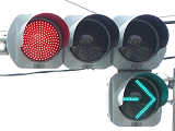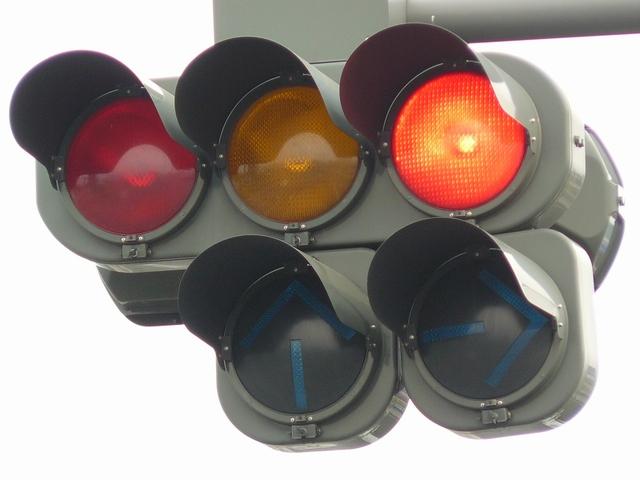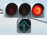 右折車分離式信号で青信号にはなりません。青灯火の部分を赤の有色レンズにし、青信号にならないことを分かりやすくしています。左赤は点灯しません。