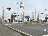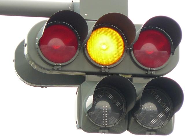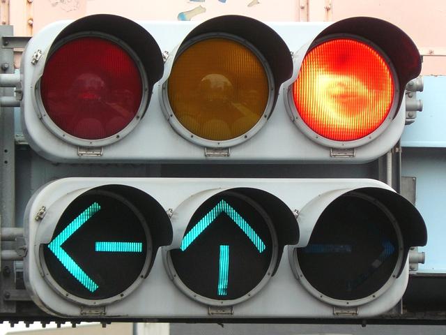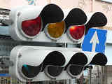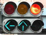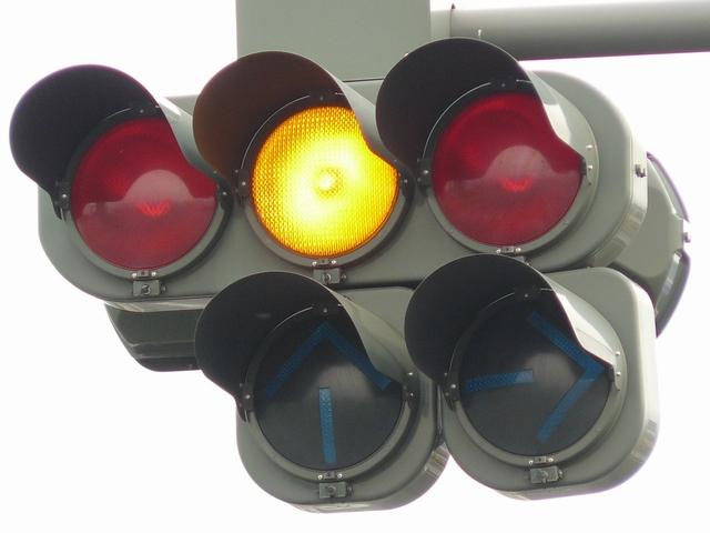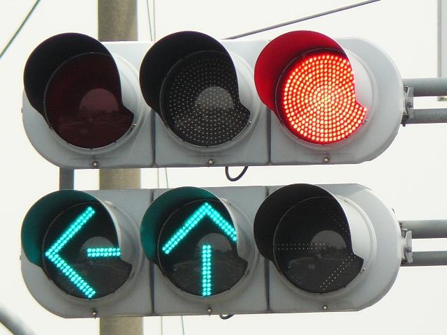 変則交差点の直進しかできない部分に設置されています。青信号にならず直進矢印信号で進行させるため、青灯火の部分を赤レンズにし、青信号にならないことを分かりやすくしています。左赤は点灯しません。