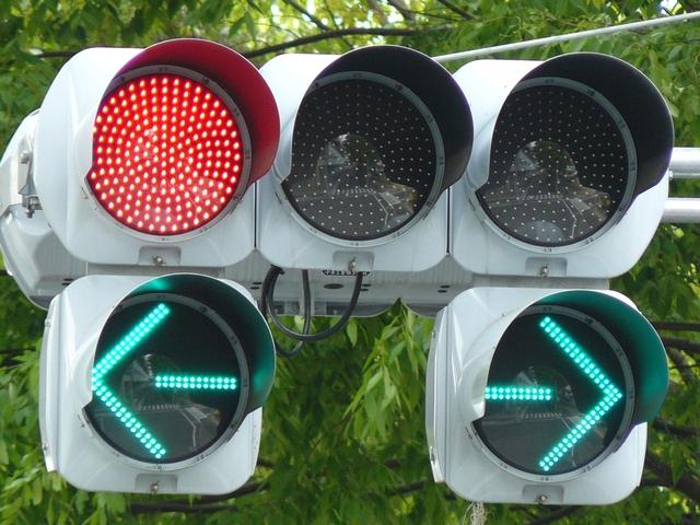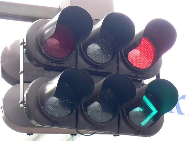 ├形交差点の時差作動側に設置されています。対向側が青信号のときは直進のみ、対向側が赤信号になったら右折もできるようになります。矢印信号で制御し、青信号にはならないため、青灯火の部分を赤レンズにし、青信号にならないことを分かりやすくしています。左赤は点灯しません。