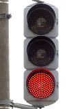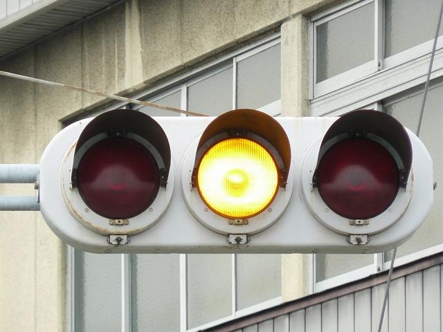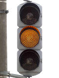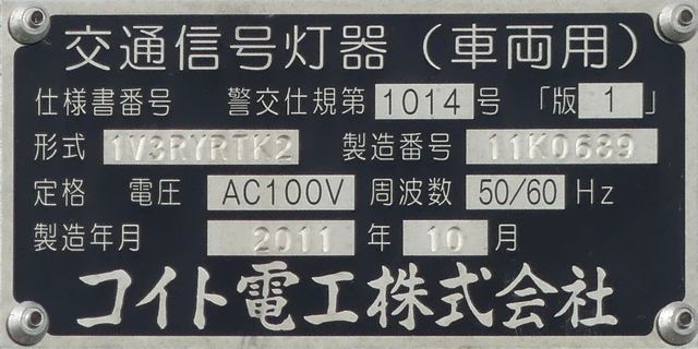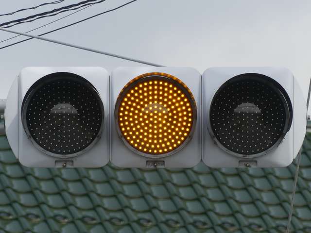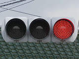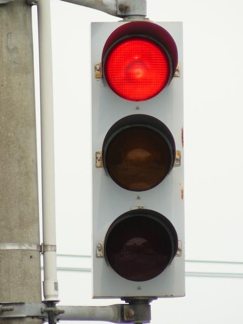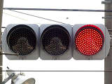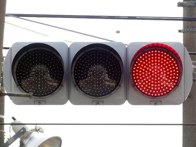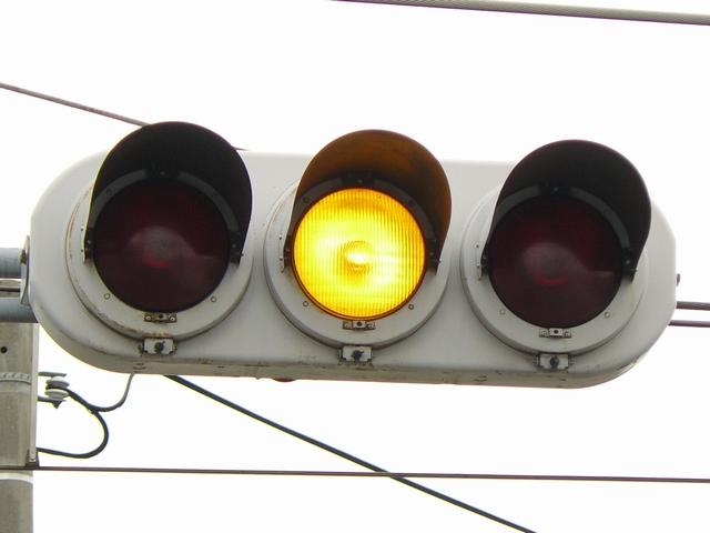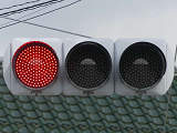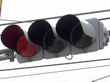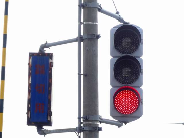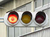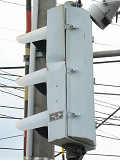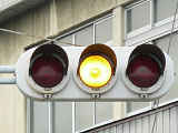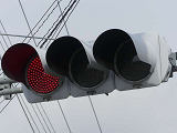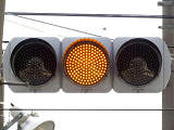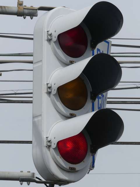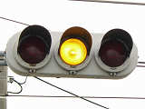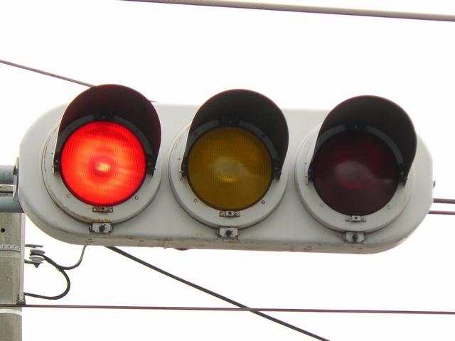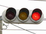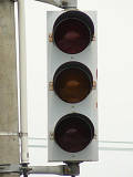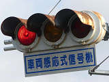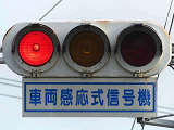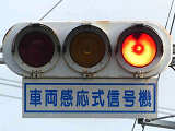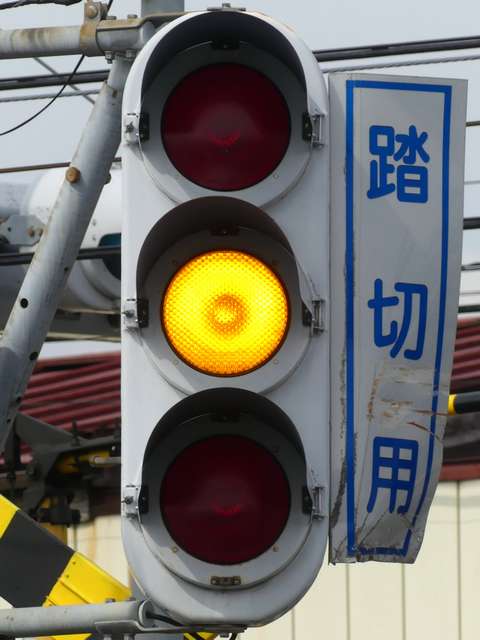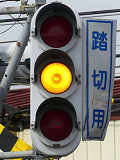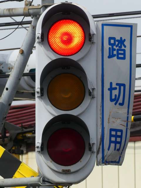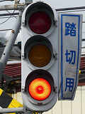 信号交差点に隣接する踏切の交差点流入側に設置されている赤・黄・赤配列の灯器です。交差点の信号が青のときに踏切での一時停止を怠らないよう下赤点滅になります。