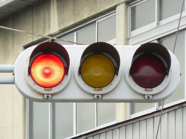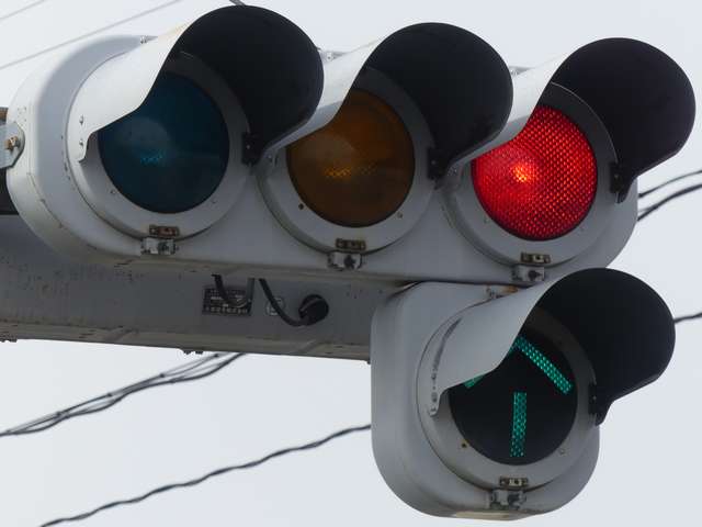 変則交差点(食い違い交差点)の第2従道路に対して赤・黄・赤配列の灯器が設置されています。第1従道路に対して青信号を表示しているときに左赤の点滅で一時停止により同時に進入させます。