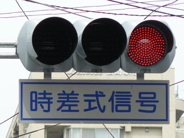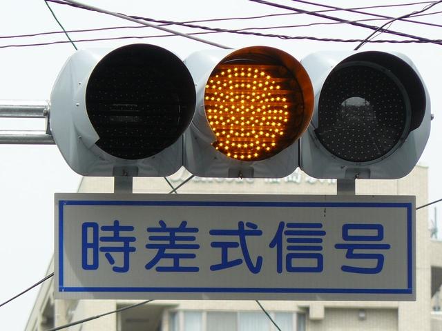 連続交差点での誤認防止のため、奥の交差点で青と黄に距離制限フードを使用しています。