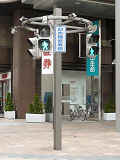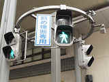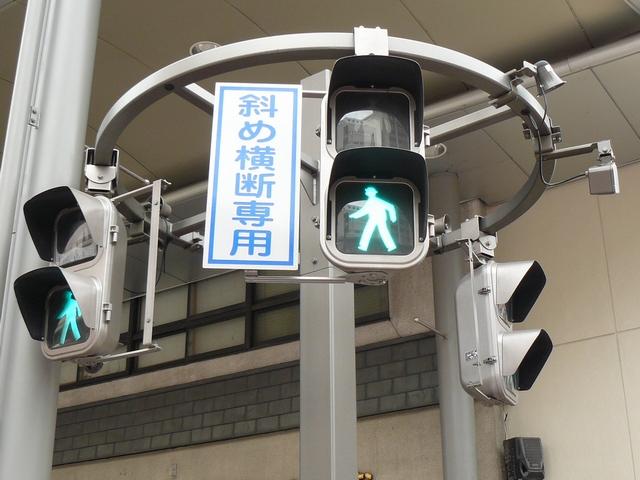 スクランブル交差点の3方向の歩行者用灯器が円形のアームに設置されています。