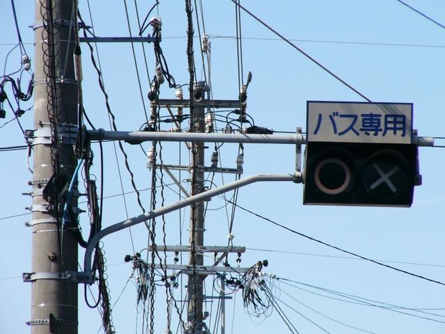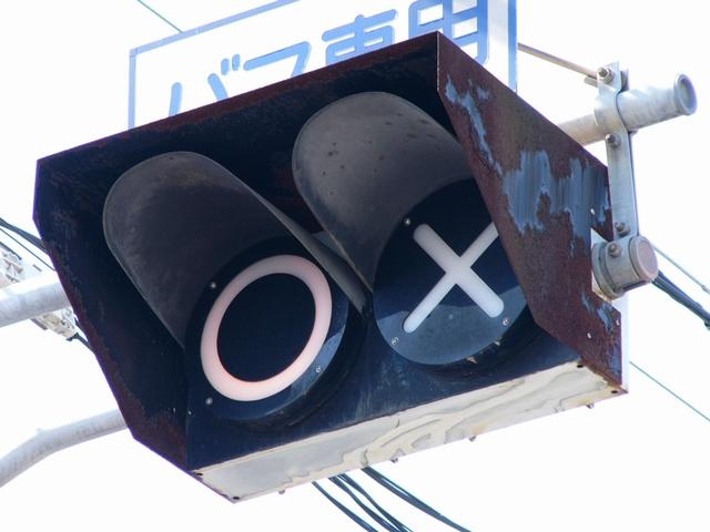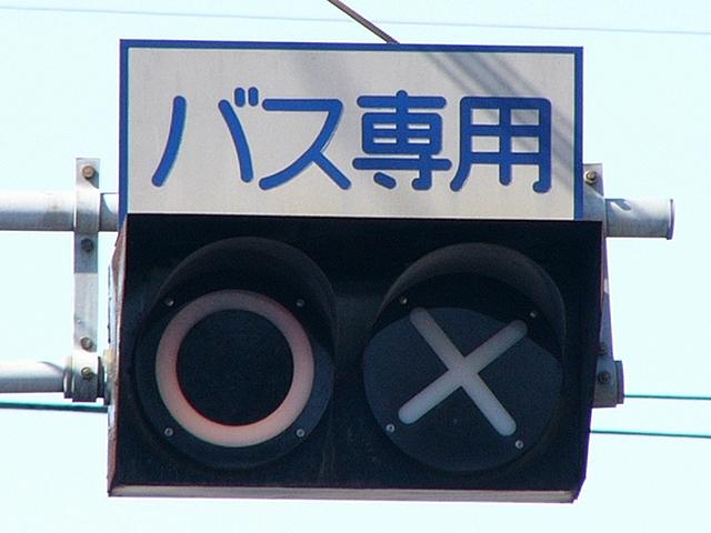 バス路線が屈折する狭くて見通しの悪い交差点の手前に設置されています。角型灯器に「○・×」のカバーをかぶせたものです。路線の反対側には見当たりませんでした。通常は○印が点灯し、対抗バスがある場合に×印が点灯するようですが、詳しいサイクルは調べていません。