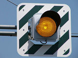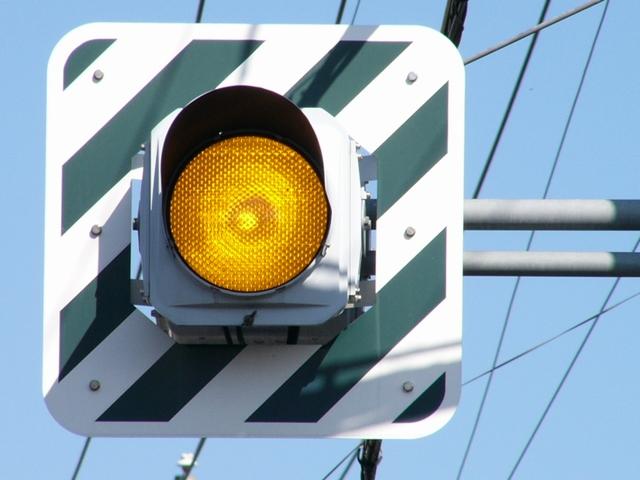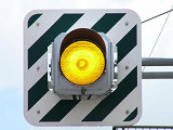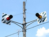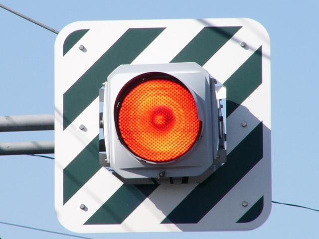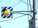 岐阜県の4方向1灯点滅は、普通の信号機のように個別にアームに設置されます。ここでは信号柱を1本で済ませるため、両面設置になっています。交差道路で交互に点滅しています。