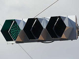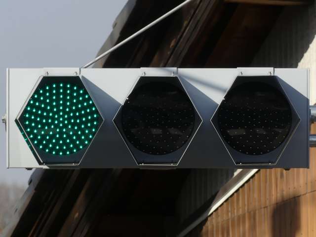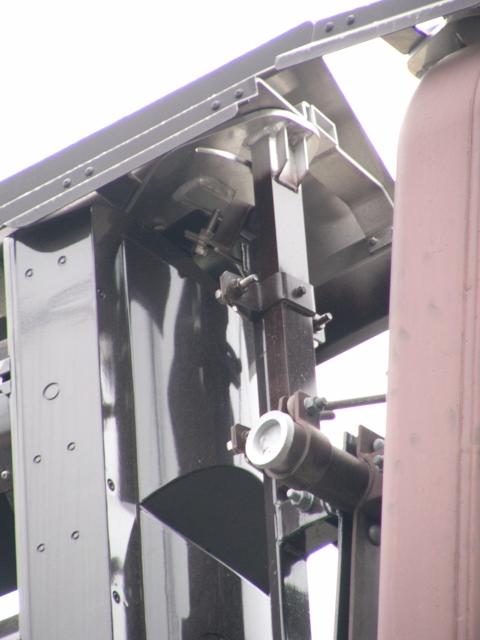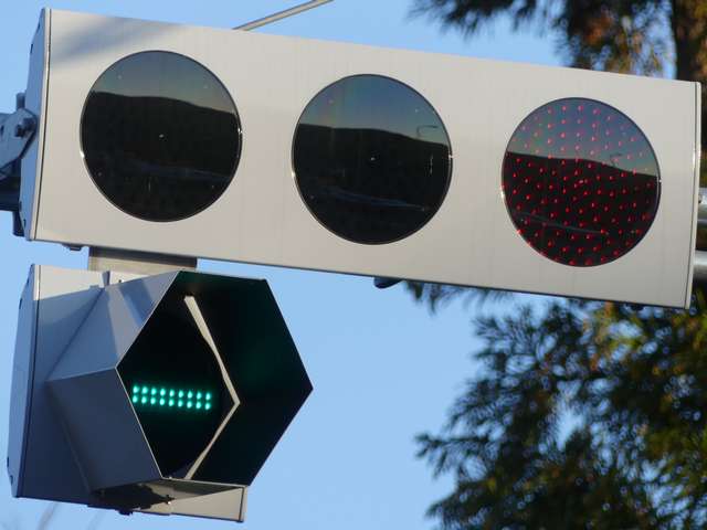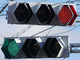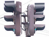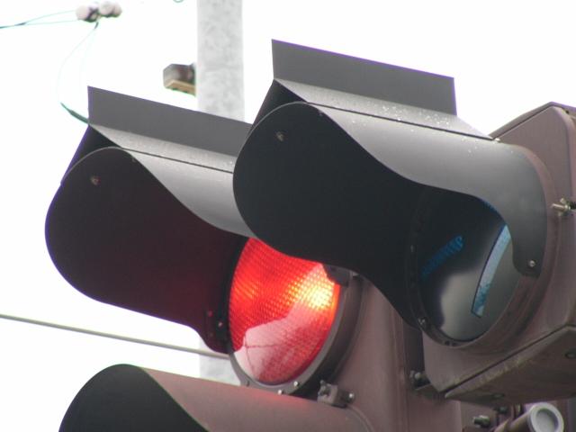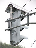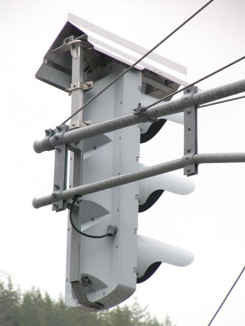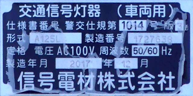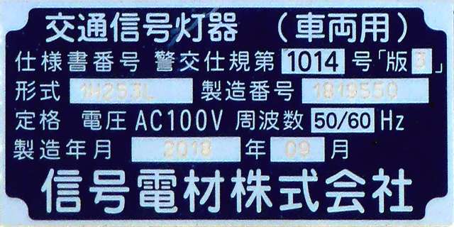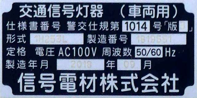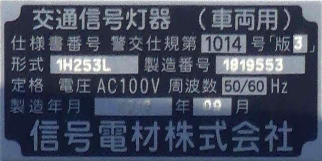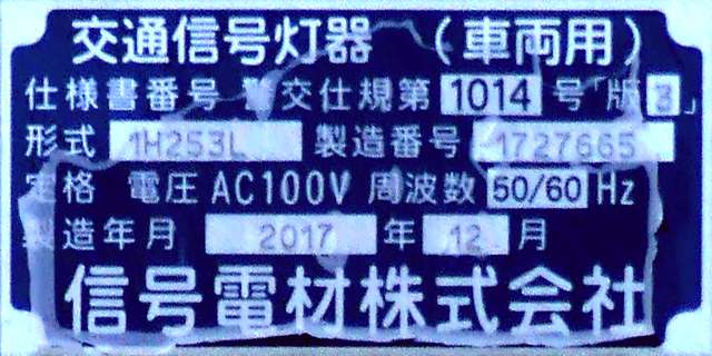 積雪対策で赤灯と矢印灯のフードの頂部が尖らせてあります(雪が滑り落ちやすい)。赤灯と矢印灯だけフードの色が違うので、フードだけ交換したように見えますが、フードの形が元のものと同じなので塗装が異なるだけのようです。おそらく融雪しやすい塗装を施してあると思われます。