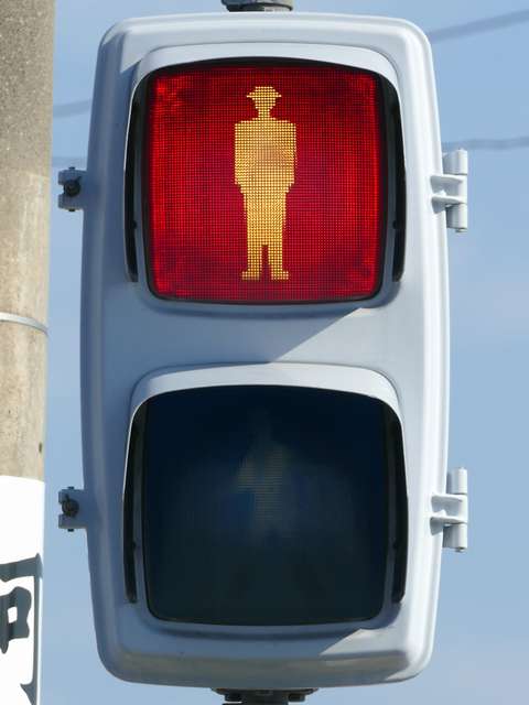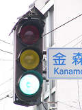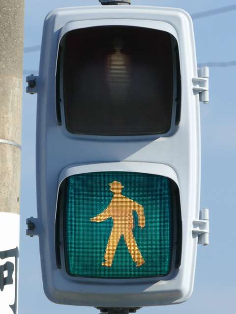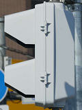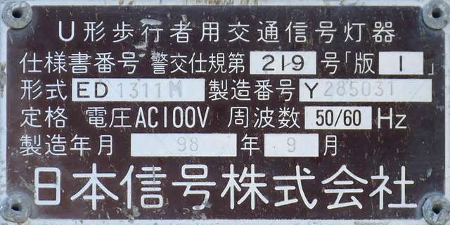 愛知県の歩行者用灯器で見られたものと同じような形状の少し下を向いた長めのフード(「愛知型フード」)が取り付けられた金属製歩行者用灯器が、この交差点に1基設置されています。北向きの灯器であり、特に西日対策のために使用しているわけではないようです。