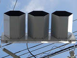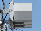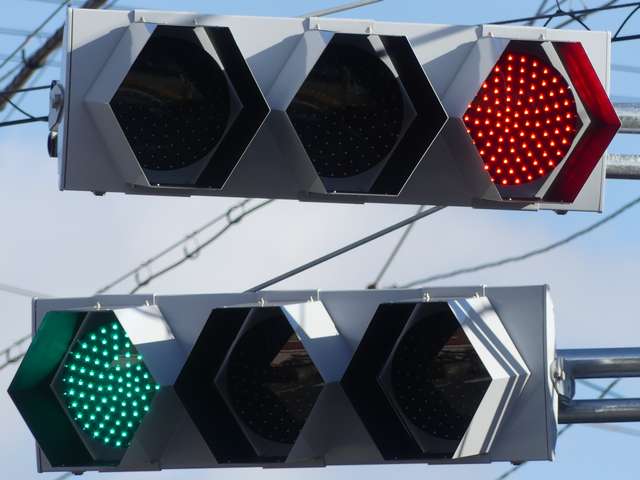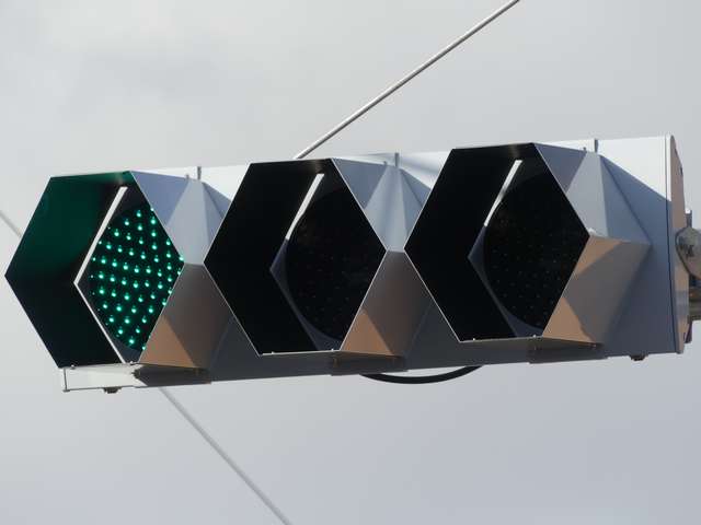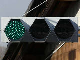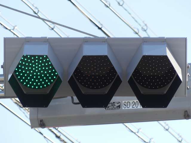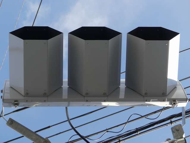 交差道路からの誤認防止のため、3色灯器はインナーフード仕様の信号電材製低コスト灯器となっていますが、矢印灯器にはインナーフードの設定がないため、信号電材モデル低コスト灯器用の6角形筒型フードを装着しています。