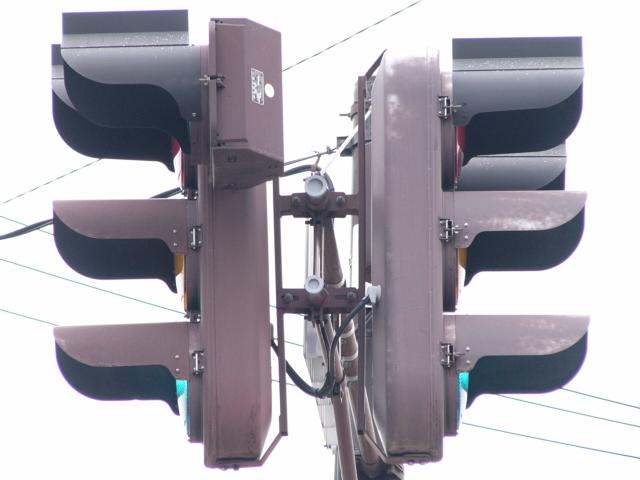 更新前は、3色灯器、矢印灯器とも筒型フードでした。(平成29年度工事)