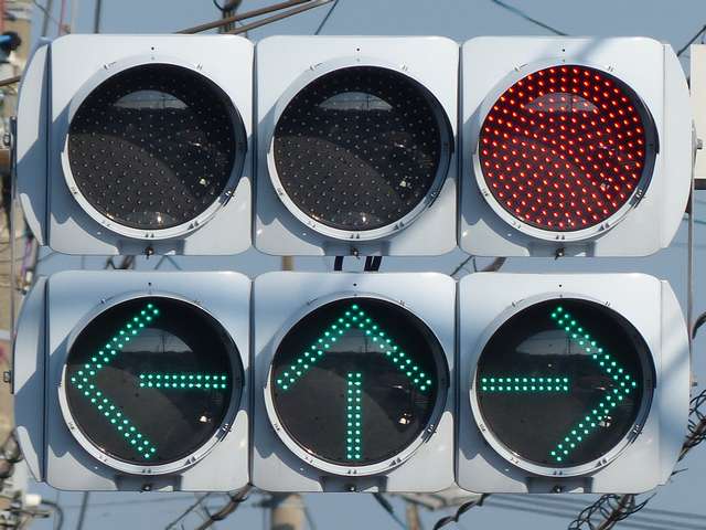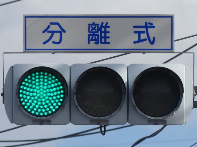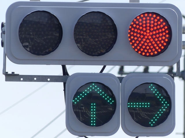 なお、対向側からの右折は禁止されていません。 現在は、時差式信号は廃止され、交互通行方式に変更されています。 |
