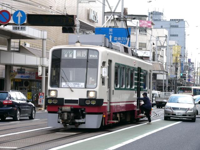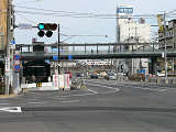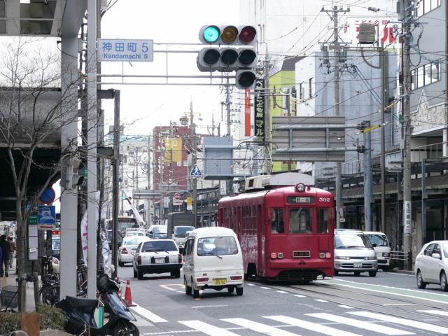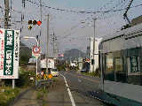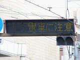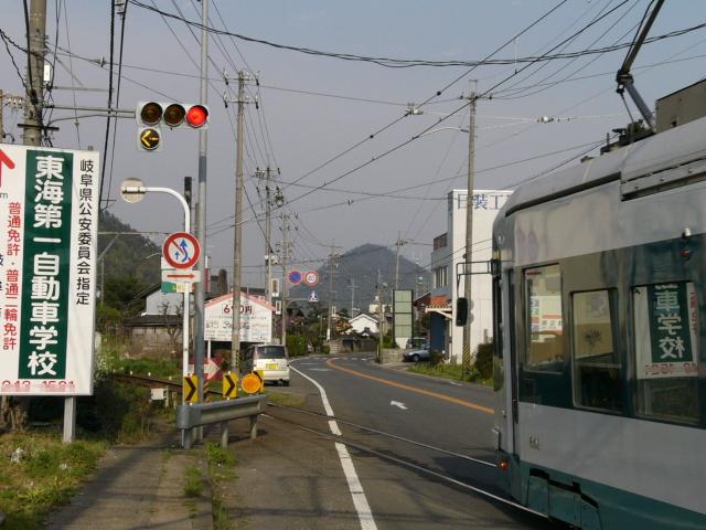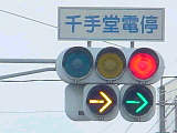 名鉄岐阜市内線は一部が路面電車となっており、電車が右左折する交差点には黄矢印信号があります。2005年3月下旬には電車が廃止目前となっていたためか、「千手堂電停」の「主要地点」標識が撤去されていました。