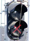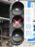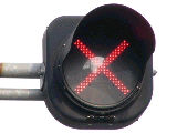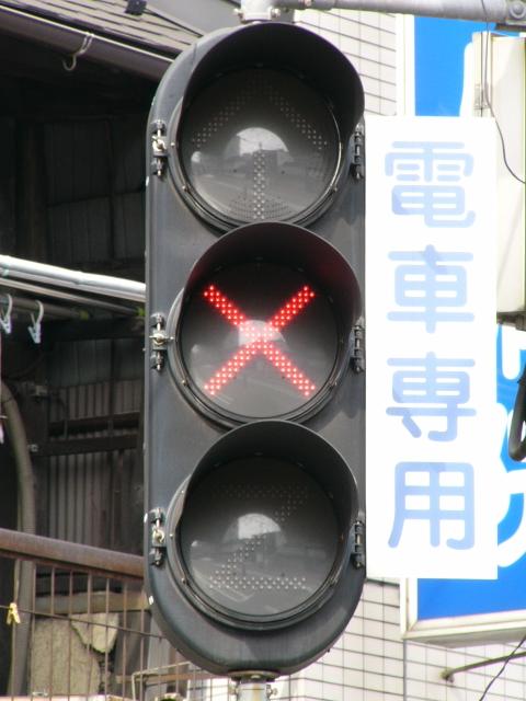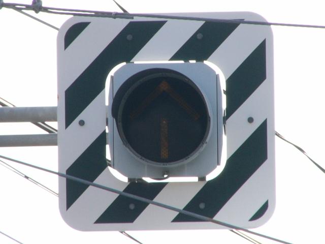 専用軌道の踏切手前に設置されています。上から「↑(黄矢印)」「×」となっています。