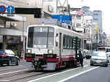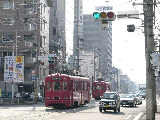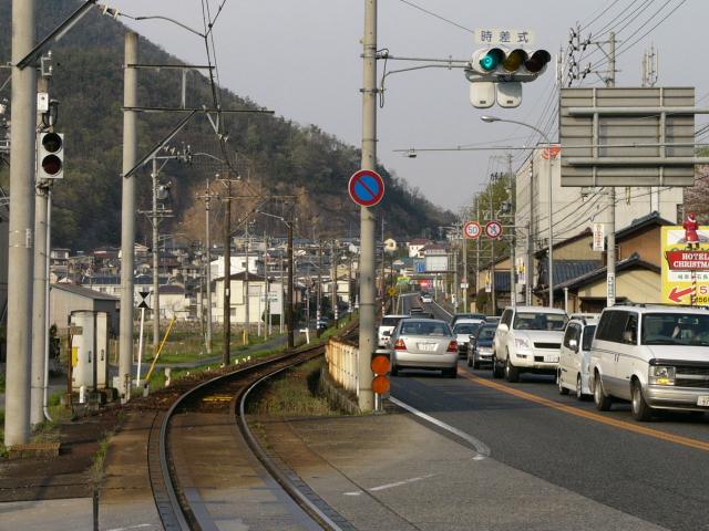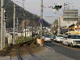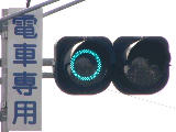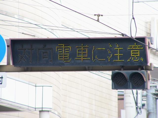 併用軌道から専用軌道になる箇所です。車両用信号の信号サイクルは、通常左黄点滅で、電車が接近した時に中黄・・・赤←(黄矢印)の順で変化します。車灯に併設されたほうの矢印灯器にはフードがありません。2基ともフードが無いので故意にはずされているようです。