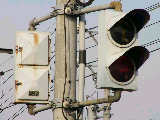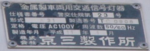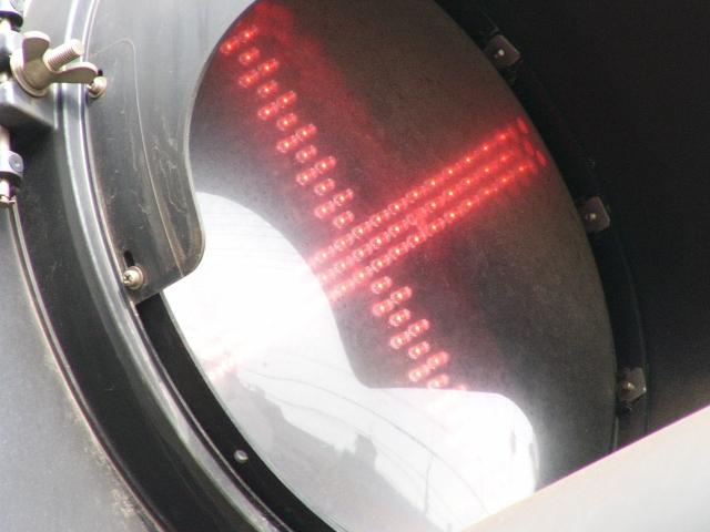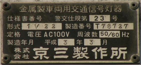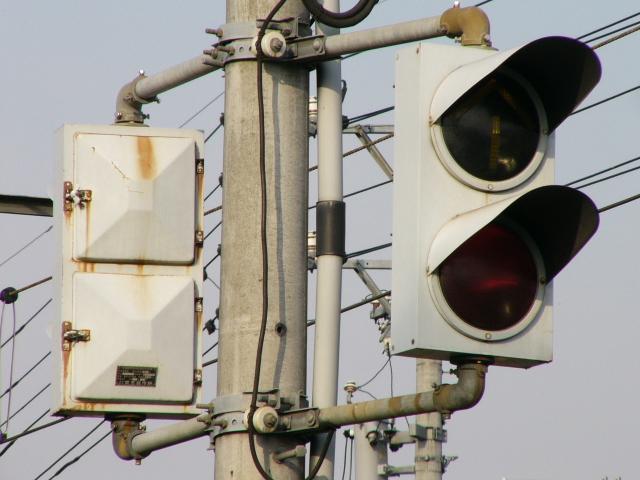 線路と道路が併走している区間の信号交差点に設置されています。通常は消灯していて、電車が接近すると点灯します。古そうに見える角型灯器ですが、なんと平成生まれです。