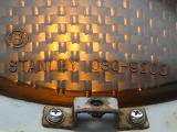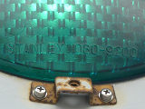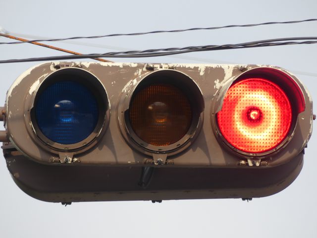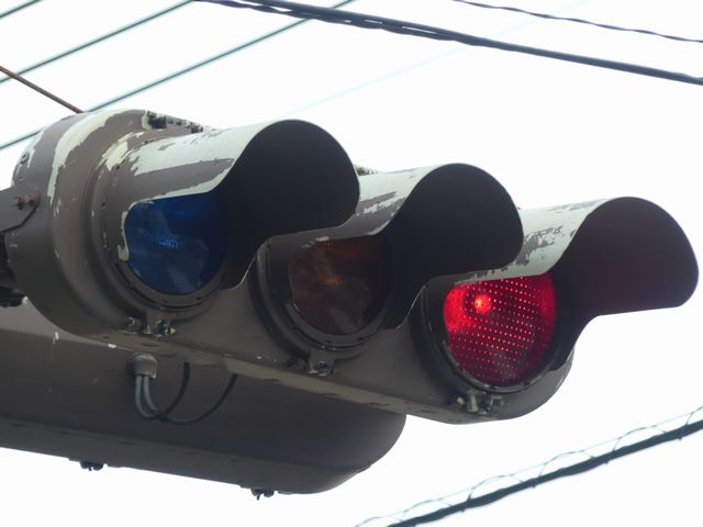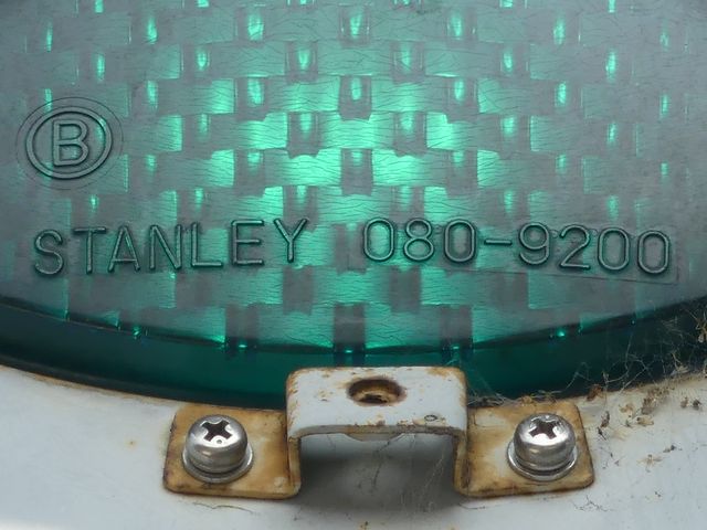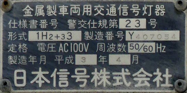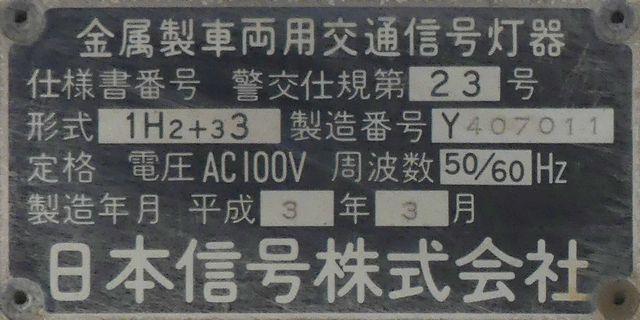 日本信号製のブツブツ模様西日対策レンズ(ダークアイレンズ)の丸型灯器です。レンズ下部の「STANLEY」文字の上に「B」の表示があり、ダークアイ仕様のレンズであることを表しています。通常は銘板の形式の後にも「B」の刻印が入りますが、この灯器では入りません。