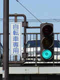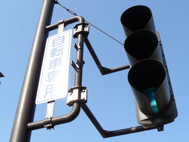 本来は屈曲した「 ] 」形のアームに灯器を設置するようですが、信号柱が車道ぎりぎりに設置されているため、屈折したアームを継ぎ足して車道から引っ込ませて灯器を設置しています。