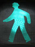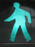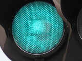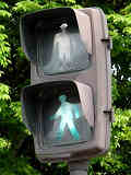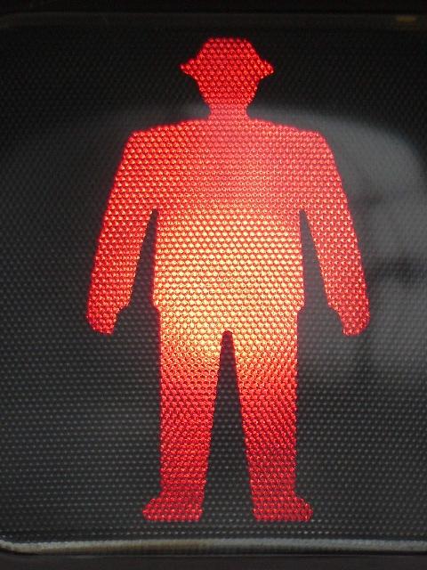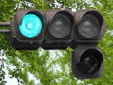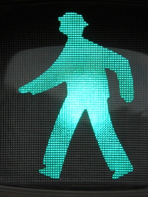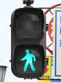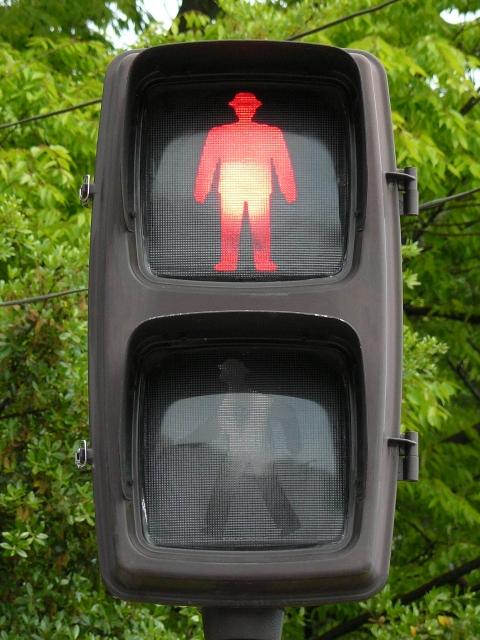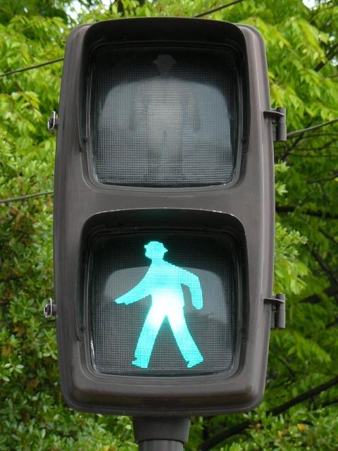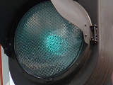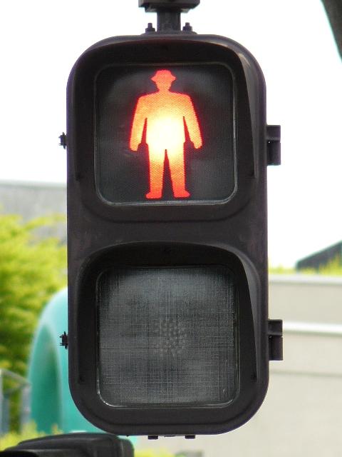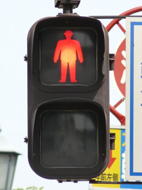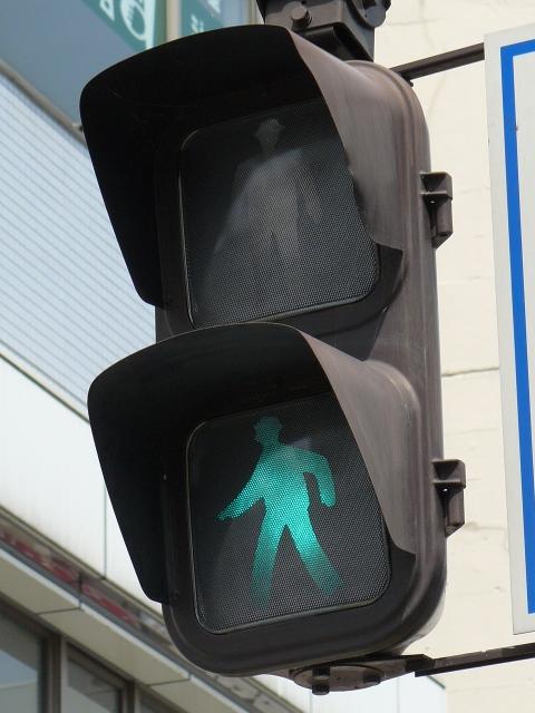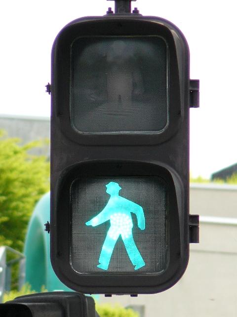 従来の電球式灯器の電球とレンズを交換したものだと思われます。通常のLED式歩行者用灯器のように人形以外の部分がマスクされ、人形が青、赤に光ります。
