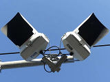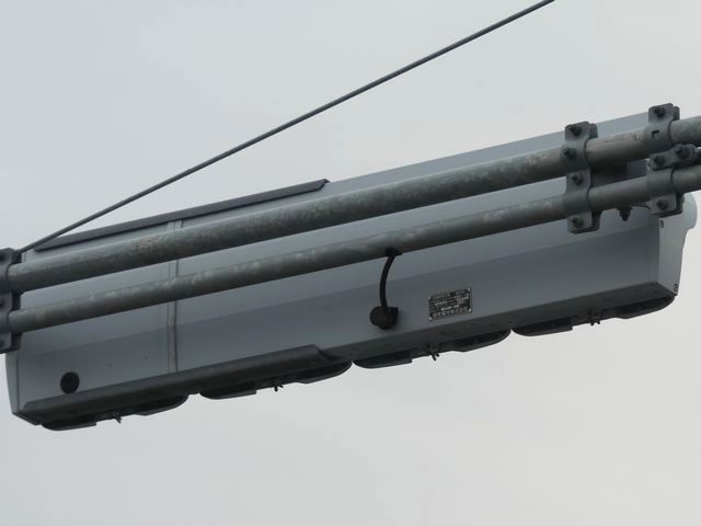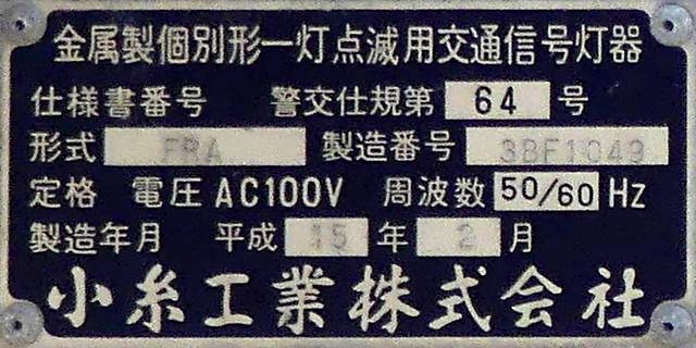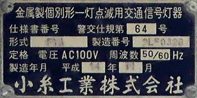 またメーカーも別々で、西進・北進方向は小糸工業製、東進・南進方向は信号電材製であり、信号電材製の方は灯器2基に対して銘板が1枚しかついていません。 |