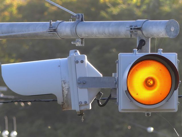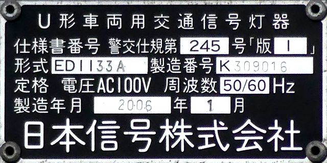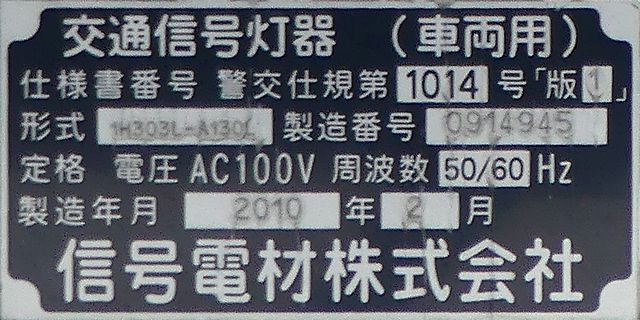 日本信号製のものと信号電材製のものが設置されており、信号電材製の方は銘板の形式が「1H303L-A130L」となっています。 |