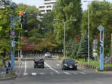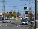 連続交差点間の滞留を防ぐため、西進での連続交差点奥側の交差点で、右折車分離と時差式信号を組み合わせた信号サイクルとなっています。西進が左折矢印・直進矢印信号のとき、対向側は通常の青信号となっており、対向側が赤信号になってから全方向の矢印が点灯します。対向側は、右折禁止の規制が行われています。