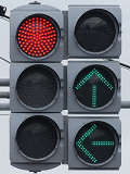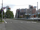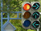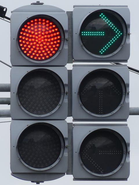 東西方向では、右折車分離のため、青信号にならず矢印信号により交通を制御しています。3つ並べた矢印灯器の間に隙間が見られます。