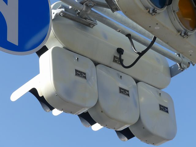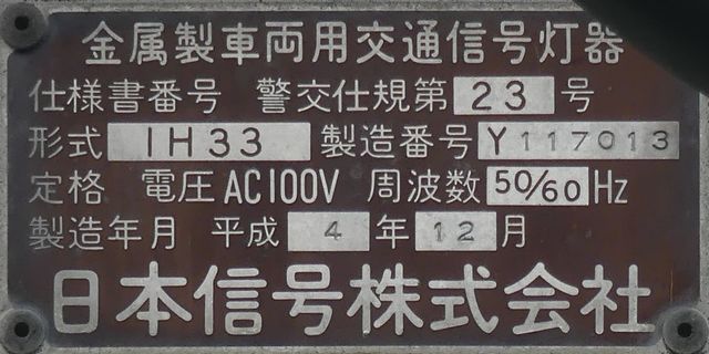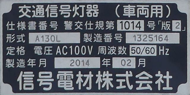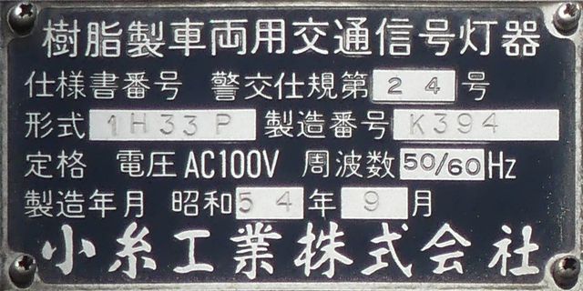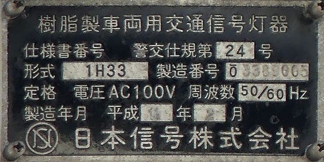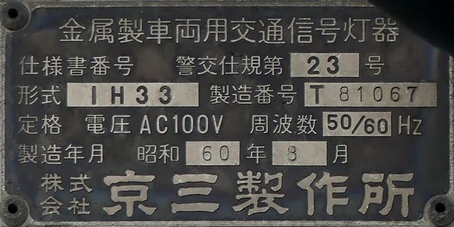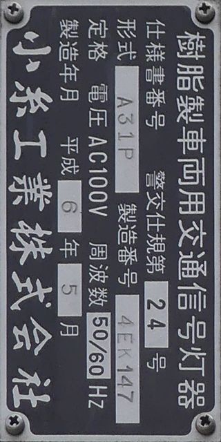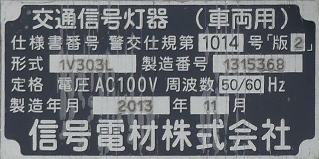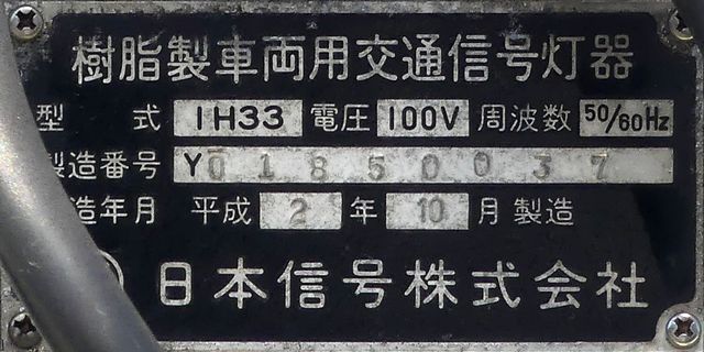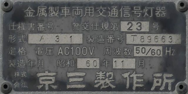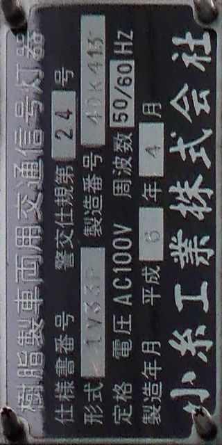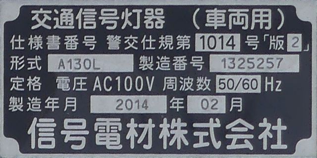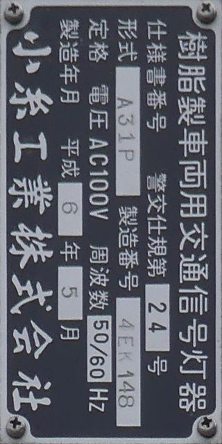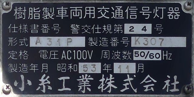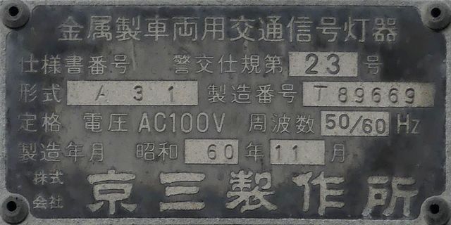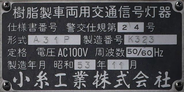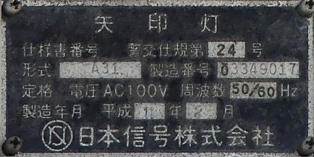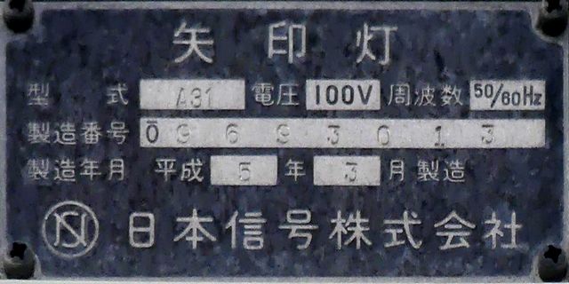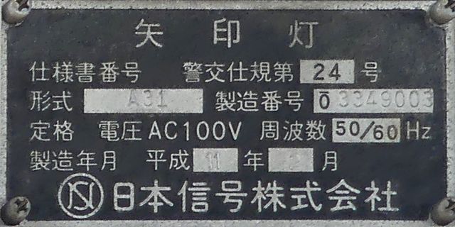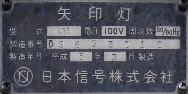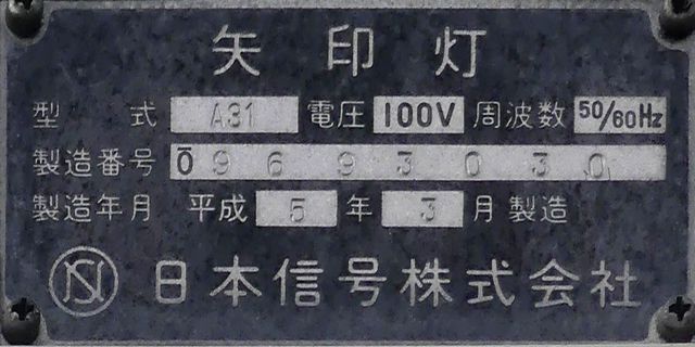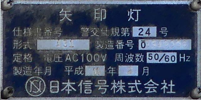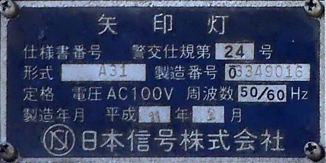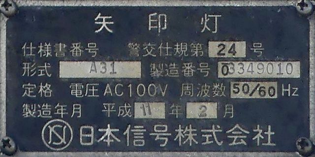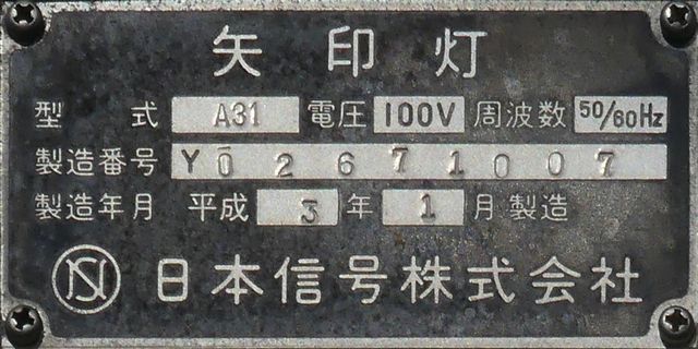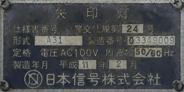 なお、本灯器の銘板はあるものの色が剥げて読めなくなっています。矢印灯器の銘板は剥がれ落ちています。