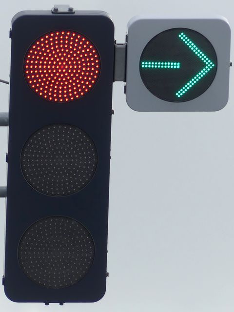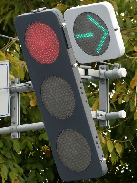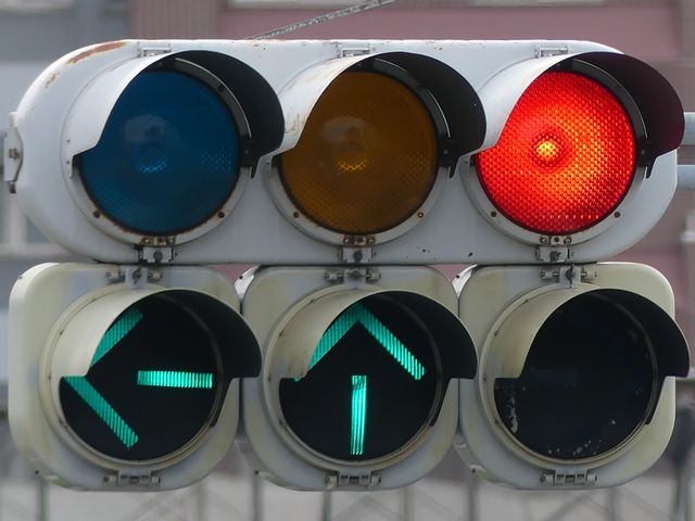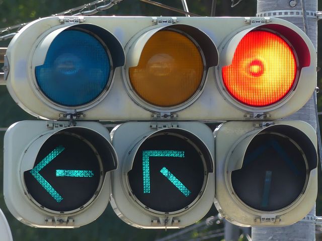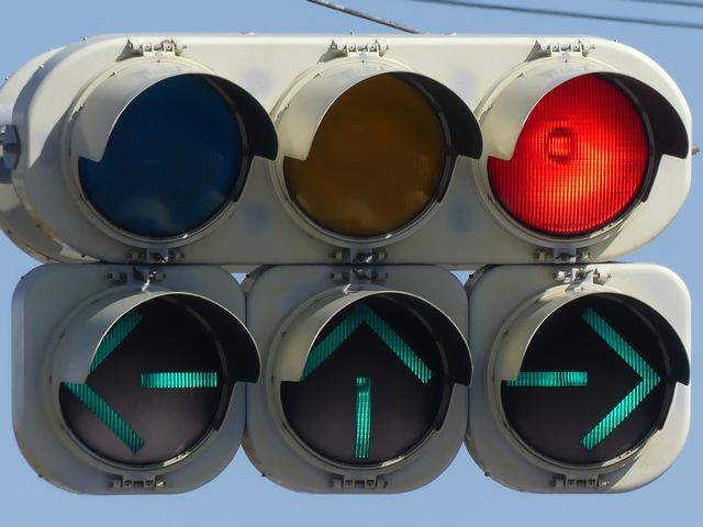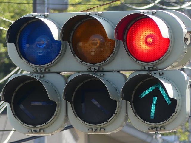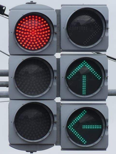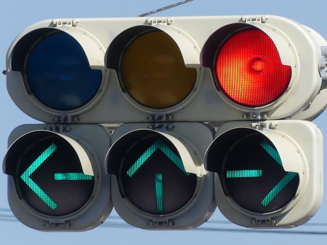 この交差点の東進では、右折車分離のため、青信号にならず矢印信号により交通整理をしています。なお、東進が左折矢印・直進(左斜め)矢印信号のとき、対向側は通常の青信号となっています。対向側は、右折禁止の規制はありません。