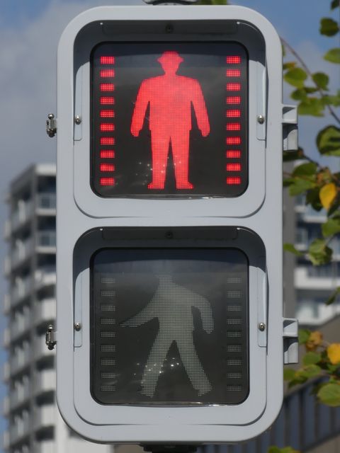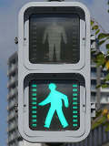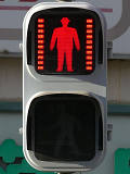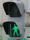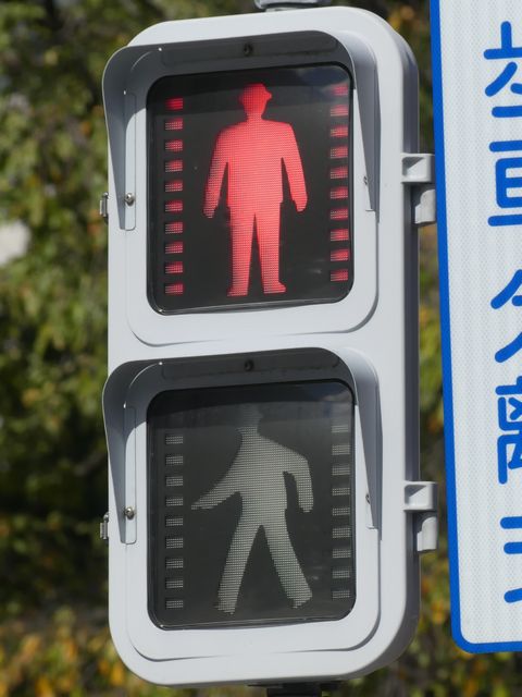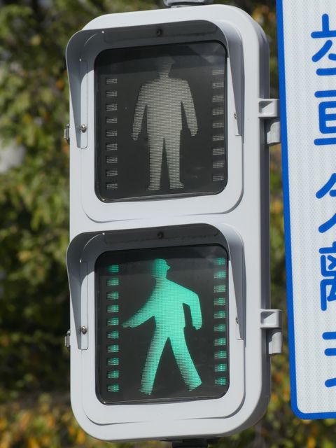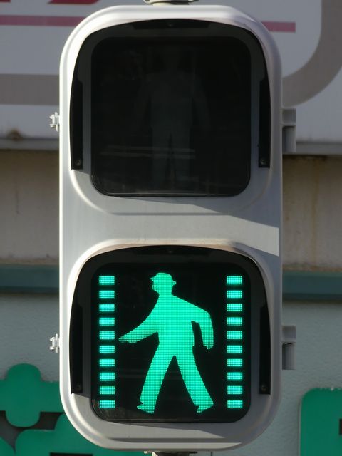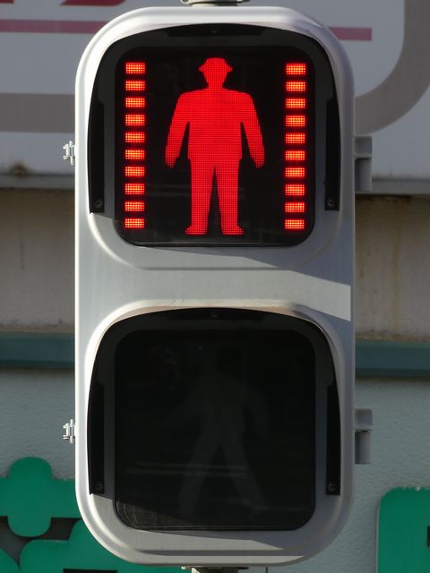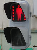 北海道の経過時間表示付き歩行者用灯器は、青の人形の横には青信号の残り時間を、赤の人形の横には青信号になるまでの待ち時間を目盛りで表示します。