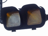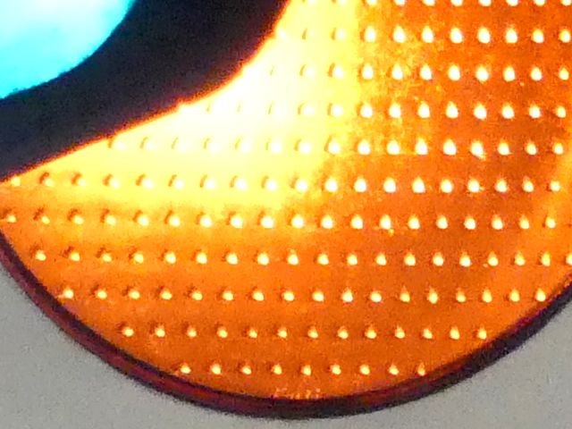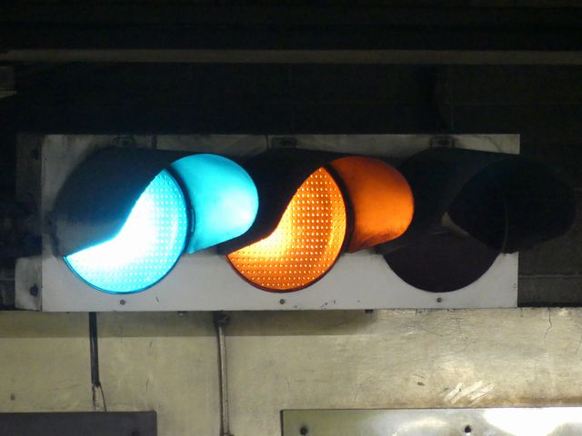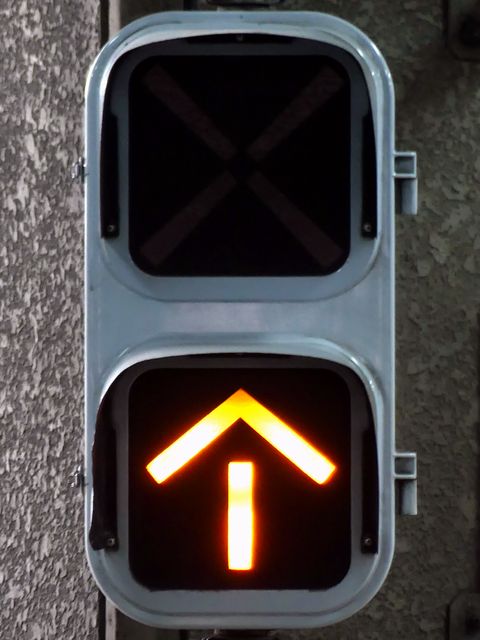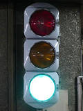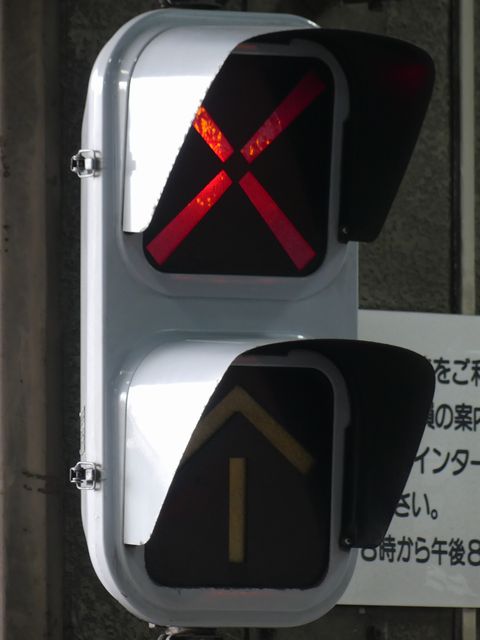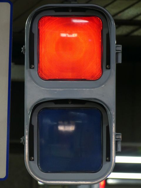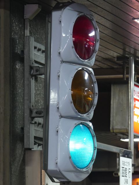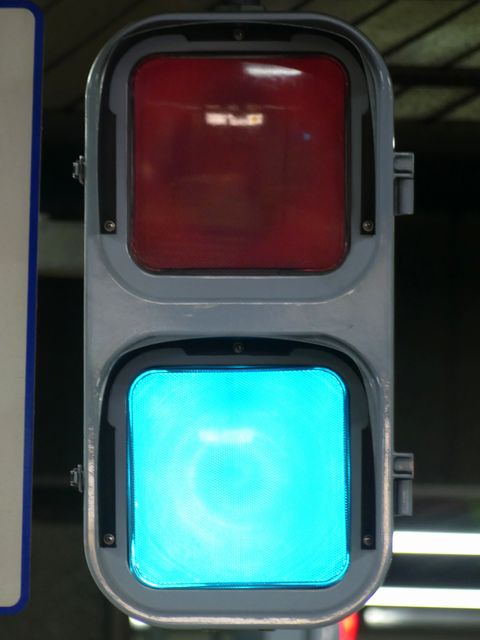 公安委員会が設置したものではないためか、歩行者用灯器は灯火面に人形が描かれていないものが使用されています。人形は描かれていませんが、変化は通常の歩行者用信号と同じで、青信号の後に青点滅し赤信号になります。 また、通常の道路用の信号機とは異なり、横断歩道側に遮断機が設置されています。歩行者用灯器の信号が赤になって数秒すると遮断機が閉まり、青信号になるのと同時に遮断機が開きます。 屋内に設置されているためか、車両用灯器にはフードがありません。
