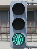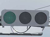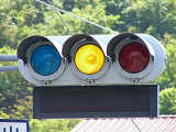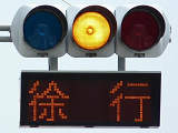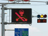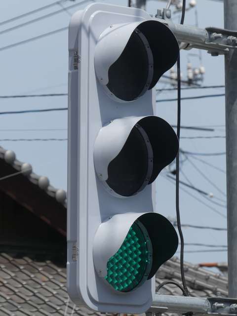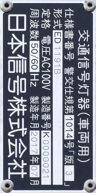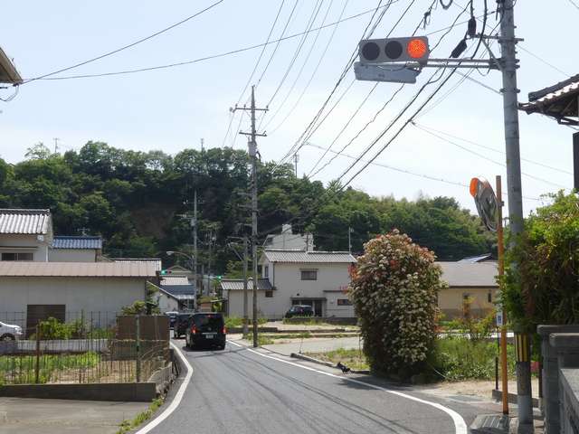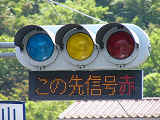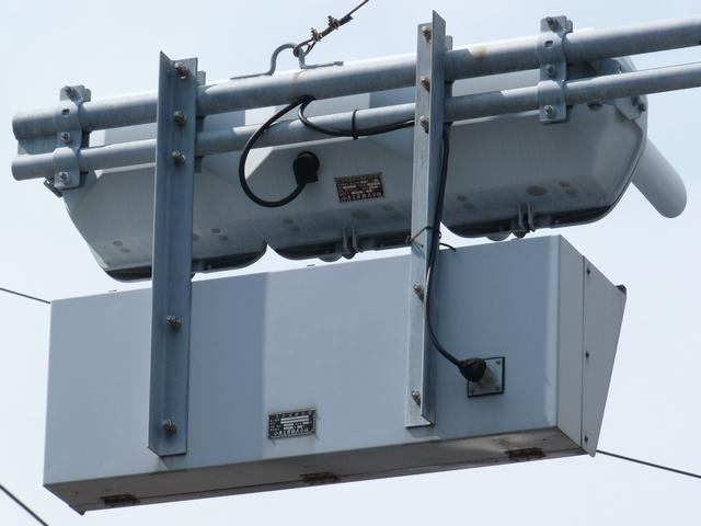 区間の入口のほか区間内3か所と区間の出口に灯器が設置されており、同一方向は同時に青信号になりますが、入口から順に赤信号に変わっていきます。区間内の信号は区間内を走る車両のためと言うより、駐車場から出てくる車両のためにある感じです。駐車場から出てくる車両は、進みたい方向の信号が青になったことを確認してから、この区間に進入することになります。 区間の西端近くには脇道があり、そちらに対しても灯器が設置されています。東進入口が青信号のときに赤点滅し、一時停止により同時に進入させます。 区間の西端には横断歩道があり、東進車両追い出し中(東進入口から順に赤信号になっていっているとき)に横断できるようになります。日本信号製縦型低コスト灯器にショートフードが取り付けられています。