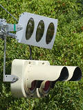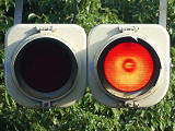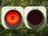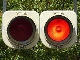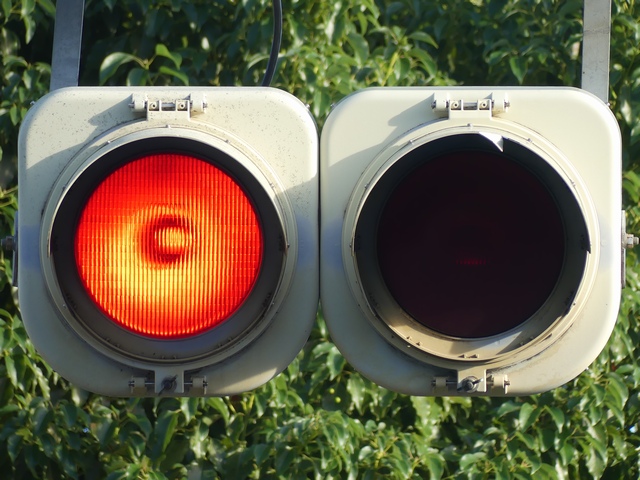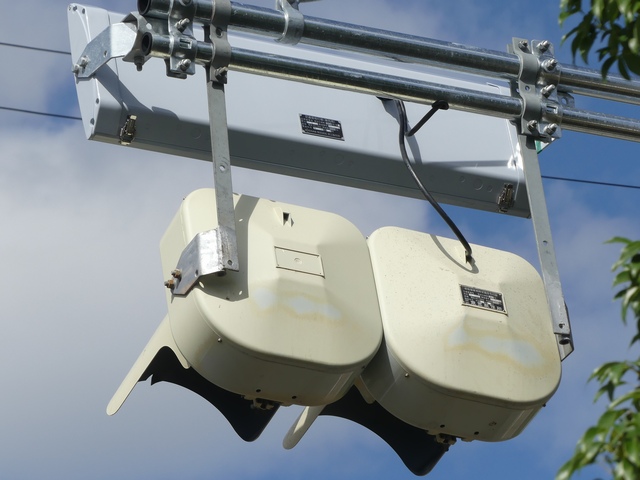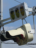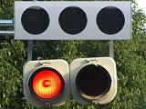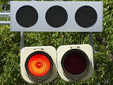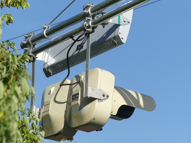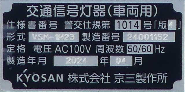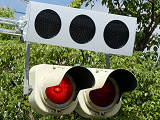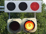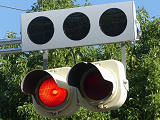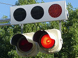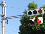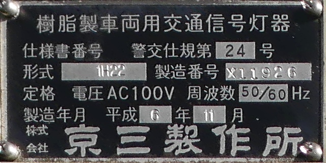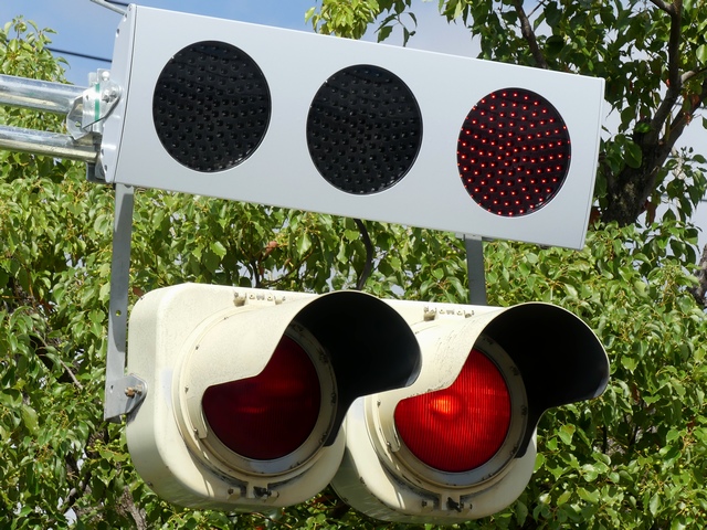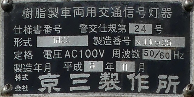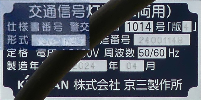 押ボタン式信号の横断歩道と並行する道路に対して設置されている灯器です。灯器の更新と制御機の更新の時期が数週間ずれたため、その間のみ見られた設置です。新しい低コスト灯器の3色灯器に交換するところ、古い制御機からの出力が赤・赤2位式灯器用のもので3色灯器では対応できないため、低コスト灯器の下に元の2位式灯器を併設しています。