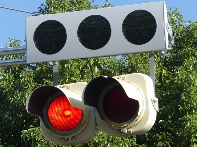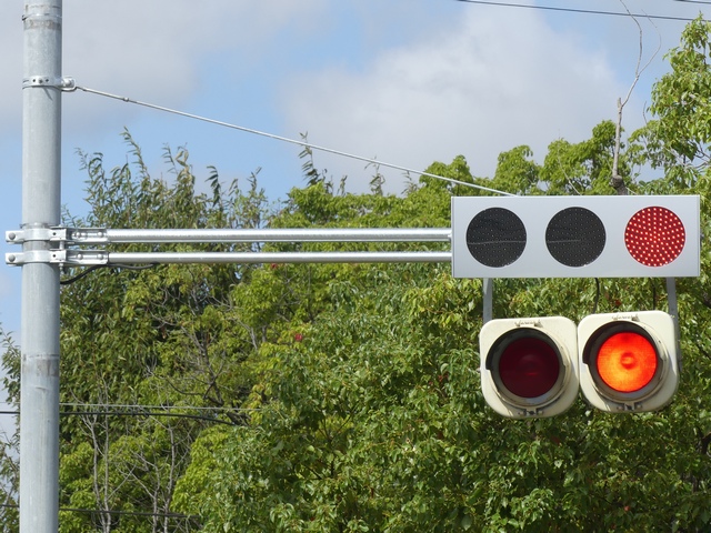 通常は、2位式灯器の右赤と3色灯器の赤が同時に点滅しています。歩行者が押ボタンを押すと2位式灯器の右赤と3色灯器の赤が同時に点灯します。歩行者が青信号になると2位式灯器の左赤のみが点滅し3色灯器は滅灯します。歩行者が赤信号になると2位式灯器の右赤と3色灯器の赤が同時に点灯します。主道路が青信号に戻ると、2位式灯器の右赤と3色灯器の赤が同時点滅に戻ります。 押ボタン箱も灯器と同時に交換されており、表示窓が2つのタイプの押ボタン箱が設置されましたが、古い制御機からの出力が表示窓1つのタイプ用のものであるため、押ボタンを押していないときは何も表示されません。