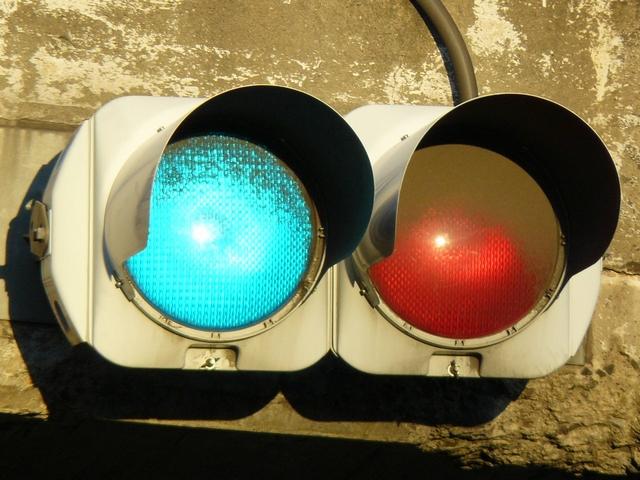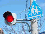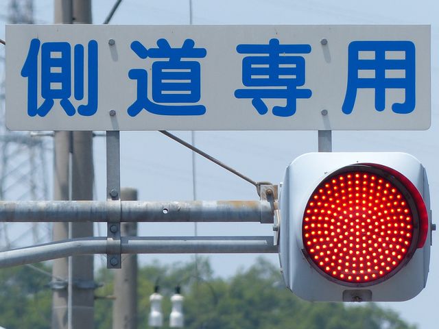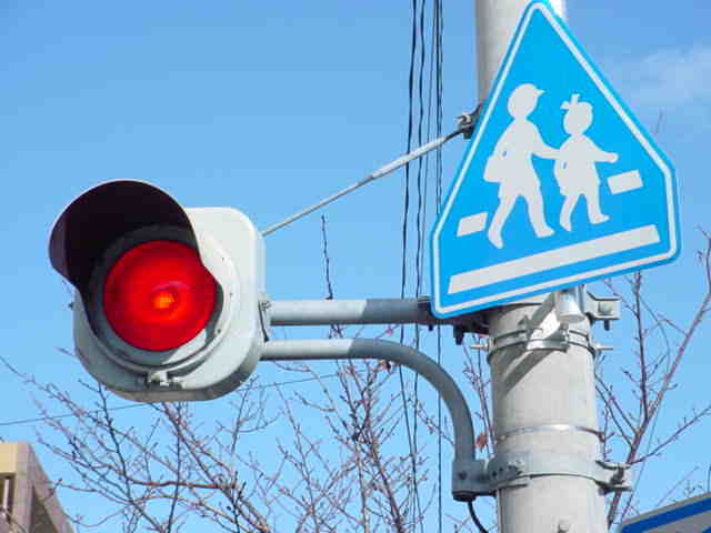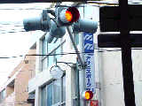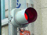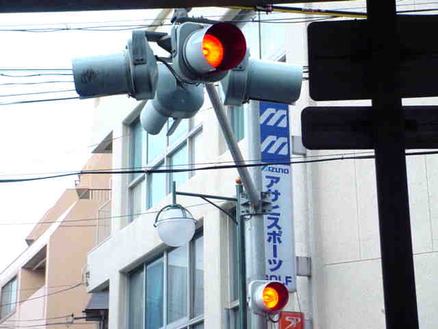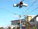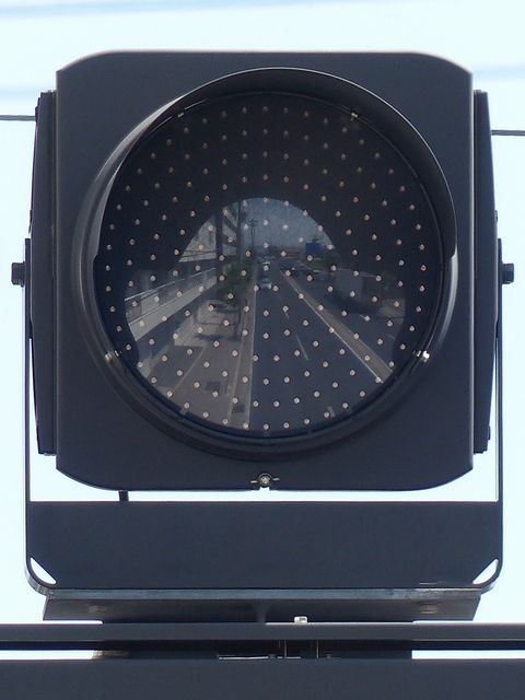 県内では通常、このような状況では2位式灯器を使用しますが、ここでは珍しく赤灯1つだけで赤点滅と赤信号を表示します。 |