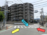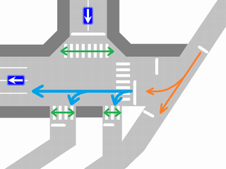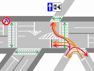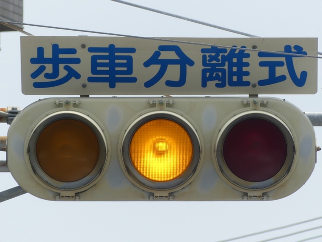 半連続交差点の東側の交差部分で、第E1従道路の車両を「黄・黄・赤」灯器の左黄点滅により進行させ、同時に第E2従道路の車両を「赤・赤」灯器の右赤点滅により一時停止させ進行させます。説明が難しいですが、西側の交差部分とは、別の交差点として扱われているようで、一部では一体の交差点として扱われています。第E1従道路及び第E2従道路から左折してW従道路の北方へ進行する場合は、一体の交差点として扱われます。歩行者が横断している横断歩道を2回横切ることになります。