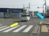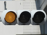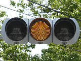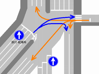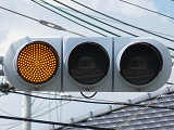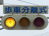 変則交差点です。左方からの右折車が右折矢印信号と青信号により右折するときに、「黄・黄・赤」灯器の左黄点滅により同時に交差点に進入させます。