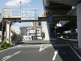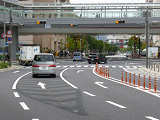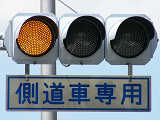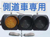 押ボタン式信号のある横断歩道のすぐ先で側道が本線に合流しているため、側道車両を「黄・黄・赤」灯器の左黄点滅により、青信号の本線車両と同時に交差点に進入させます。