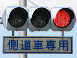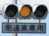 信号交差点のすぐ先で側道が本線に合流しているため、側道車両を「黄・黄・赤」灯器の左黄点滅により、青信号の本線車両と同時に交差点に進入させます。