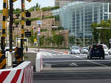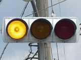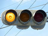 踏切信号と交差点の信号は、踏切の動作に連動します。列車が接近すると踏切平行側の青信号が延長されます。