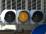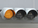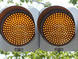 信号交差点に隣接する交通量の少ない信号交差点で「黄・黄・赤」灯器と「赤・赤」灯器を使用して交通整理をしています。