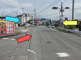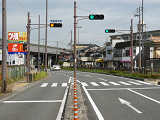 第1従道路で一方は交通量が少なく、もう一方は交通量が多く、また右折が多いため、交通量の少ない方を「黄・黄・赤」灯器の左黄点滅、交通量の多い方を青信号で進行させています。