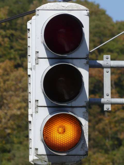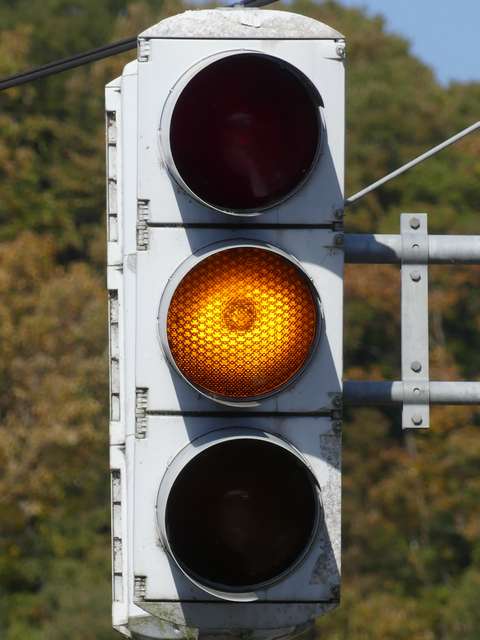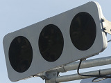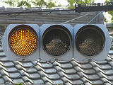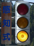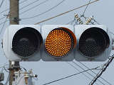 変則交差点に変則的に交差する交通量の少ない従道路に対して「黄・黄・赤」の変則配列の灯器が設置されています。