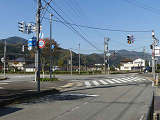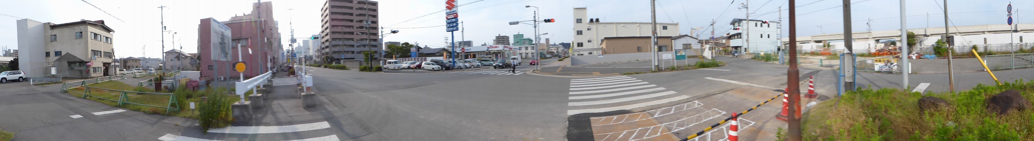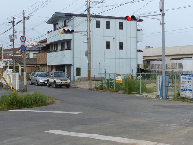 踏切に隣接する信号交差点です。踏切の手前にあたる方(西進側)は、すぐ先に踏切があることの注意喚起のため、青信号にならず、「黄・黄・赤」灯器の左黄点滅により注意させながら進行させます。