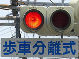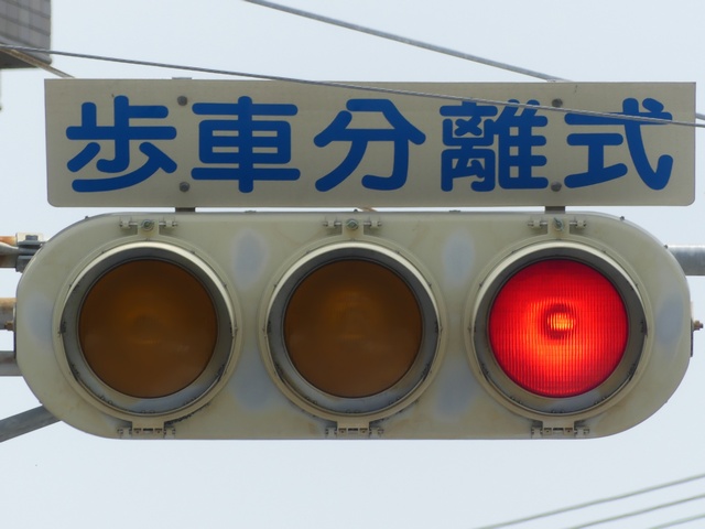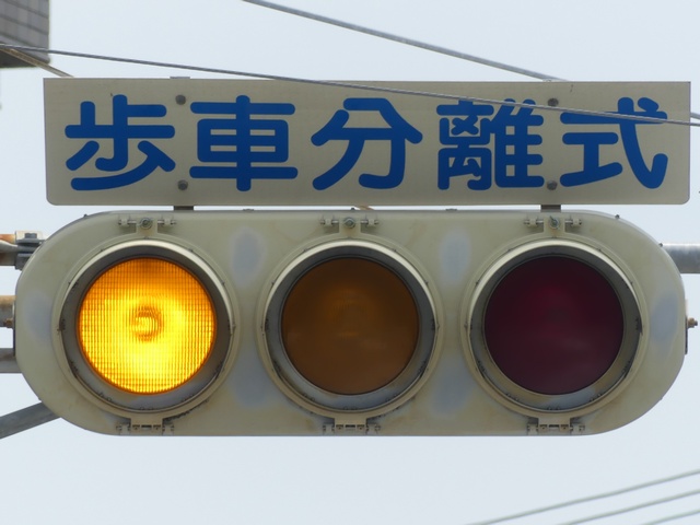 キ形交差点です。第1従道路が青信号のときに、第2従道路の一方(7時〜21時は軽車両を除く歩行者用道路)を「黄・黄・赤」灯器の左黄点滅により、もう一方を「赤・赤」灯器の赤点滅により同時に交差点に進入させます。