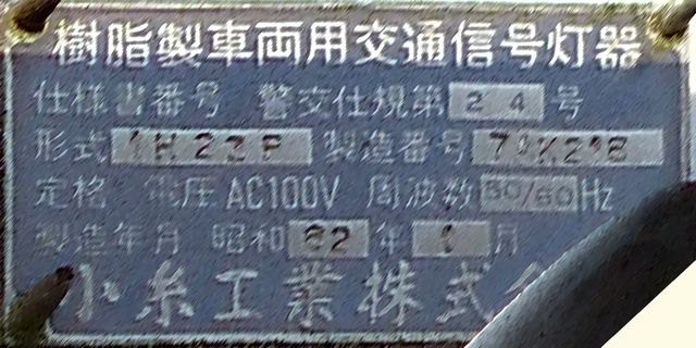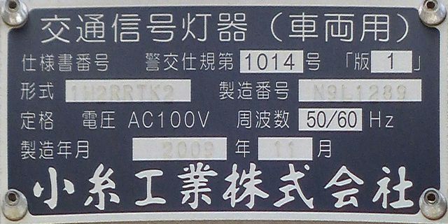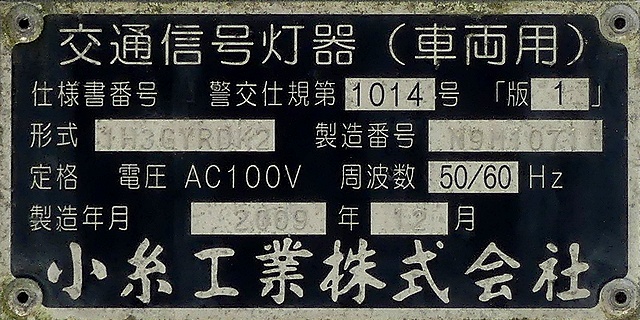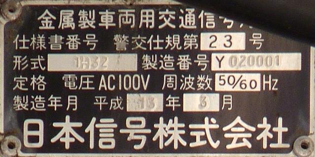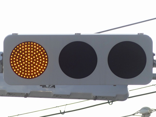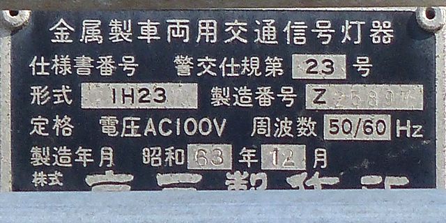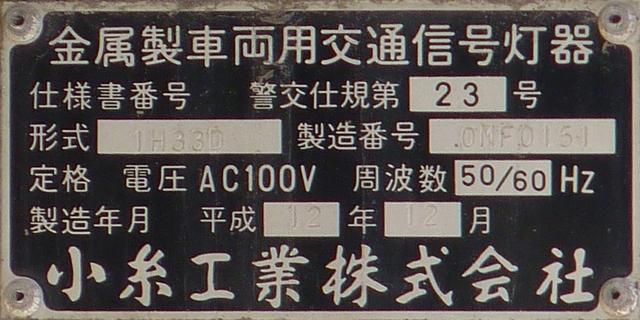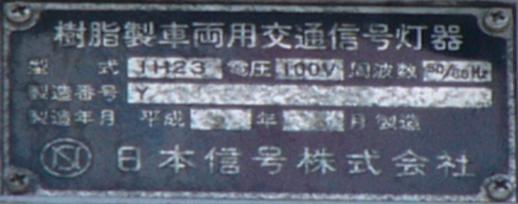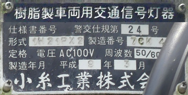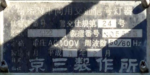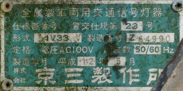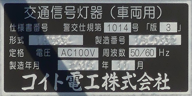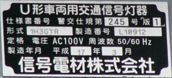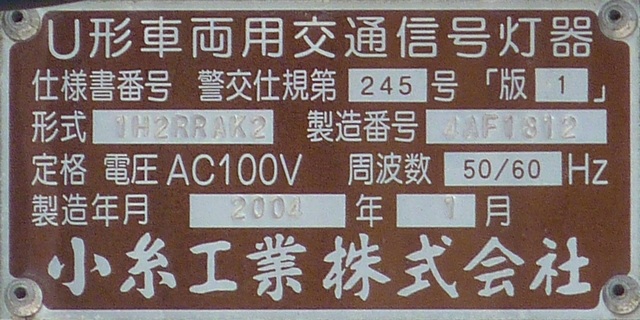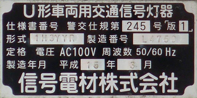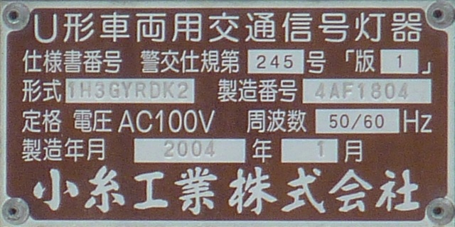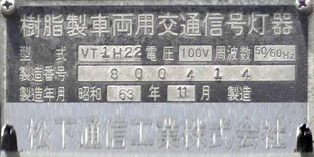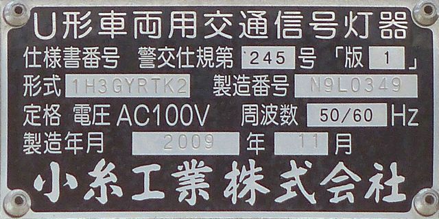 歩道橋に設置されている「黄・黄・赤」灯器は、銘板の形式が「1V3YYRDK2」となっており、「V」の部分が縦型であることを表しています。LEDの配列も縦型のものとなっていることから、当初は縦型で設置されていたのかもしれません。